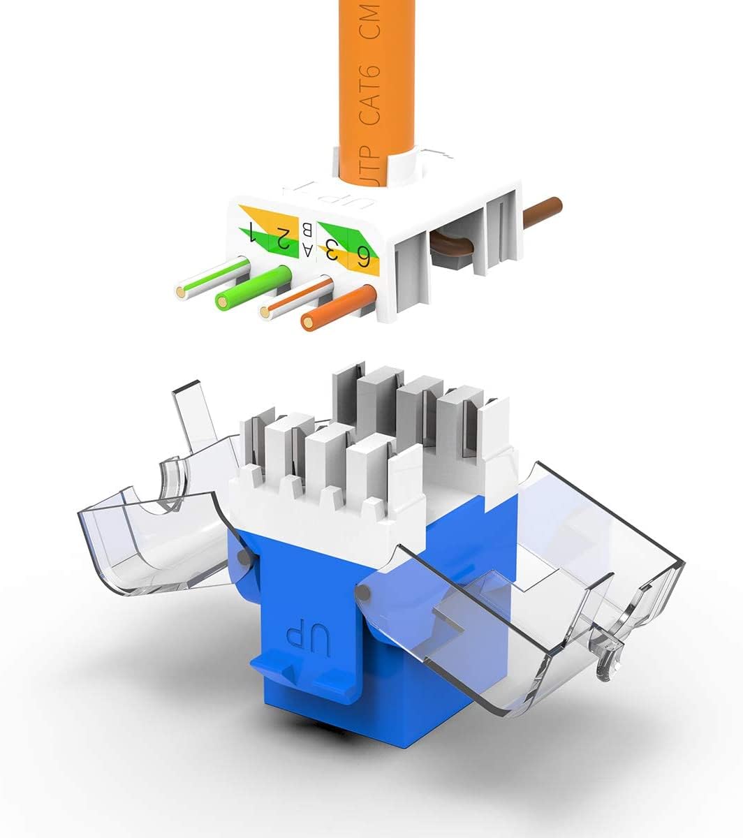 - Self-terminating, no tool required: This toolless UTP CAT6 keystone Jack is a female RJ45 connector for networking;The cable conductors can be terminated by a 180 Degree snap-fit cap being pressed into place, designed to smoothly snap into most of the standard keystone applications