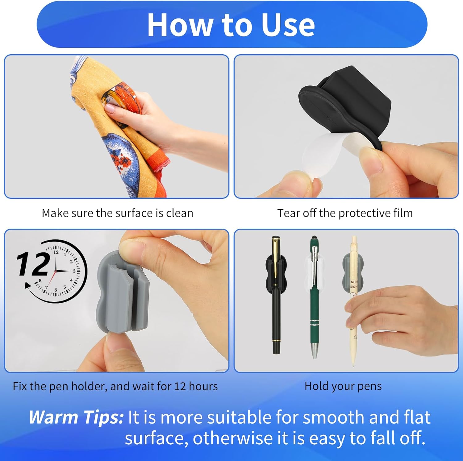 - 【Space Saving & No More Searching For A Pen】We offer 12pcs adhesive pen holders to keep everything organized. Adding these pen holders & pencil holders to the areas where we regularly use pens throughout the house, office, and classrooms, etc. They make pens, pencils, and markers available without cluttering our space. No more lost pens, No more pens rolling off desks