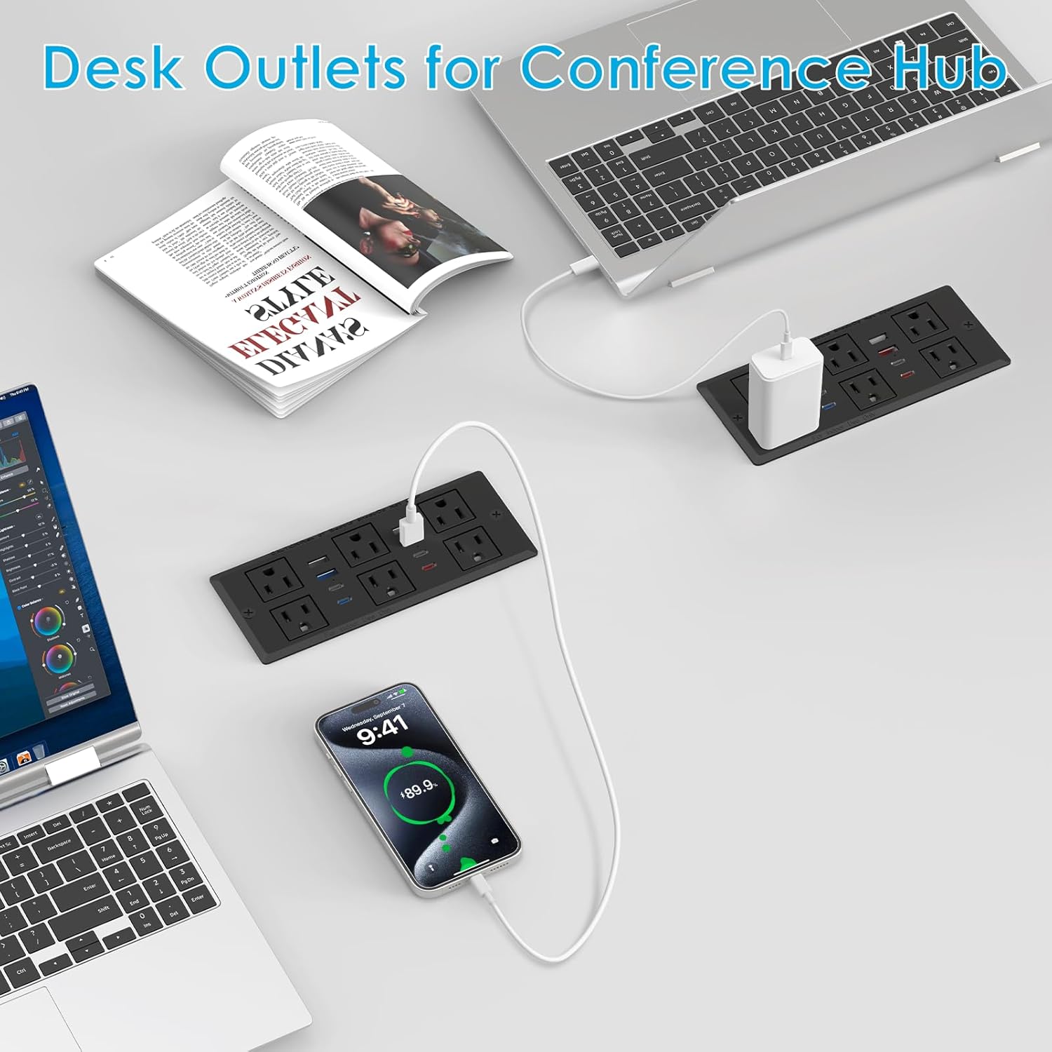 - Dual-Rows Recessed Power Strip surface plug in 6 AC Outlets & 8 USB strip charging station (PD 30W & 20W).Rich configuration combination is great addition to conference, furniture narrow table, standing desk etc.
