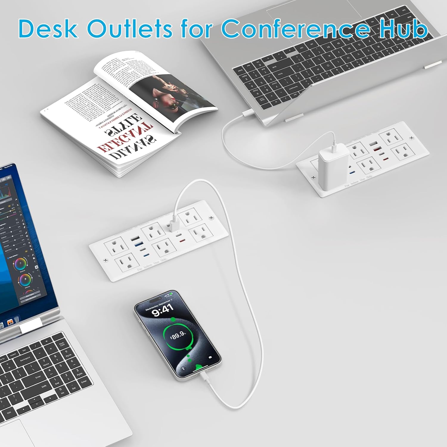 - Desk flush mount recessed outlet can use up to 14 devices, offer more faster charging usb ports and outlets for those who need them and help organize tabletop small power devices. Great addition to conference table, standing desk,office,home etc.