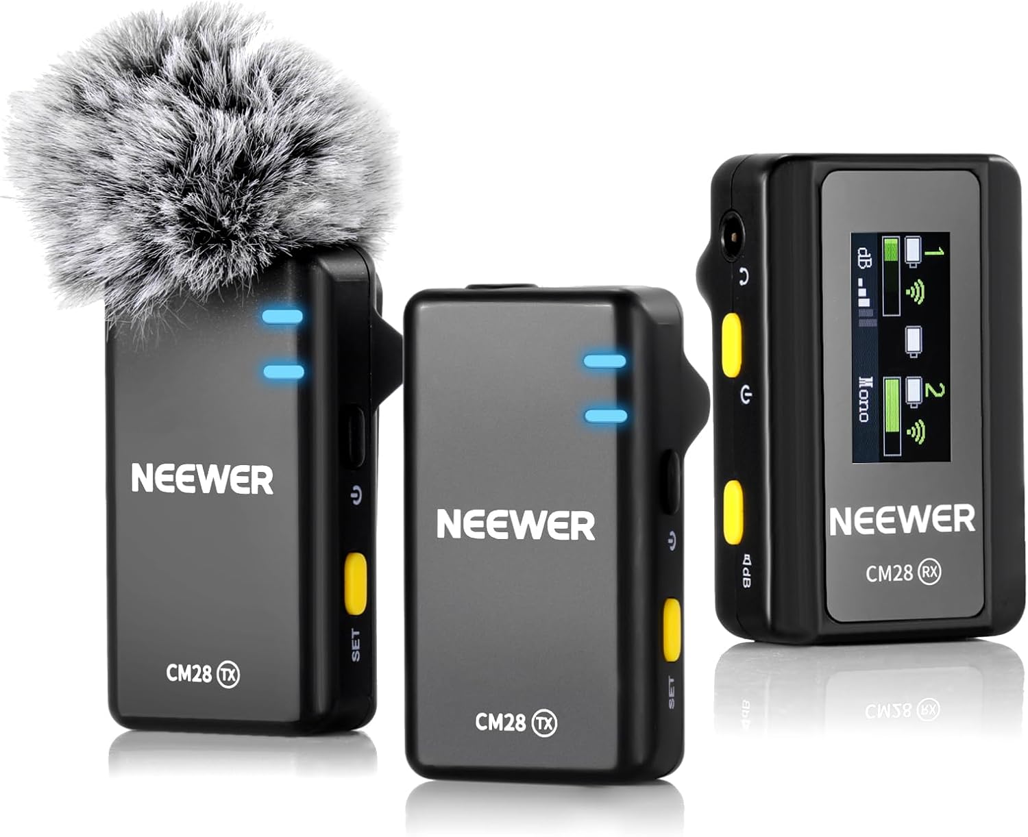 - 【Professional Wireless Lavalier Mic Set】 NEEWER CM28 mini tiny clip on Wireless Lapel Microphone Set has 2 transmitters (TX) and 1 receiver (RX). Work for 9 hours (TX) and 8 hours (RX) once fully charged. Clip on collar, shirt or handheld for outdoor audio video recording, stage, interview, fitness instructor sports and other live streaming. A USB C charging cable and a 3 in 1 USB C charging cable included, charging case not included