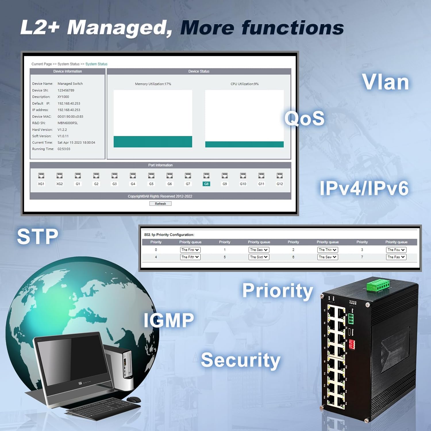 - 【Outstanding L2+ Management】The switch not only support easy management function like Ring Network, VLAN, STP/RSTP, but also IPv4/IPv6 Management and Static Route.