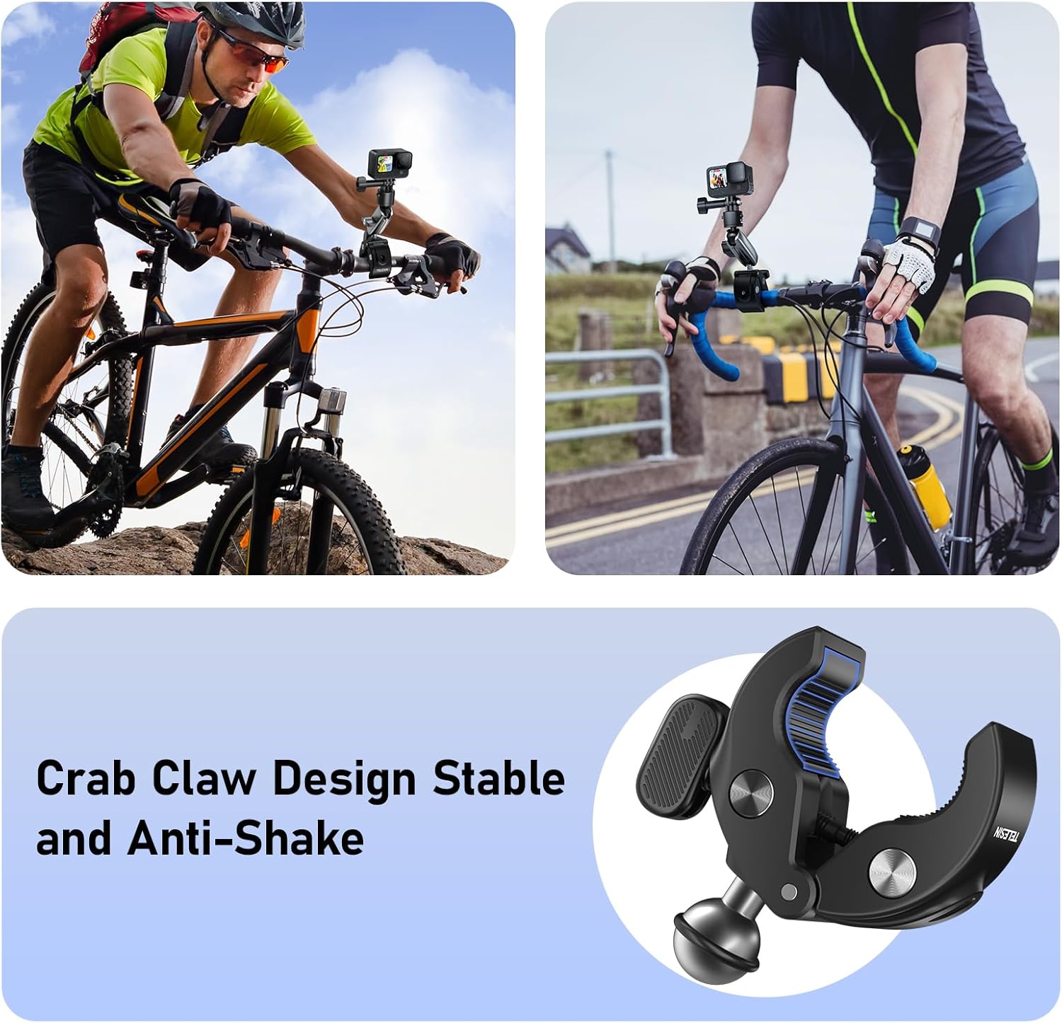 - 【Dual 360 Rotation Ball Joint】 This camera bike motorcycle mount adopts double ball joint design, the upper and lower parts can be adjusted 360 degrees at will to adjust the shooting direction, the clamping is more stable, and will not be offset or loose. No need to worry about stability even for long movement, riding or static clamping.