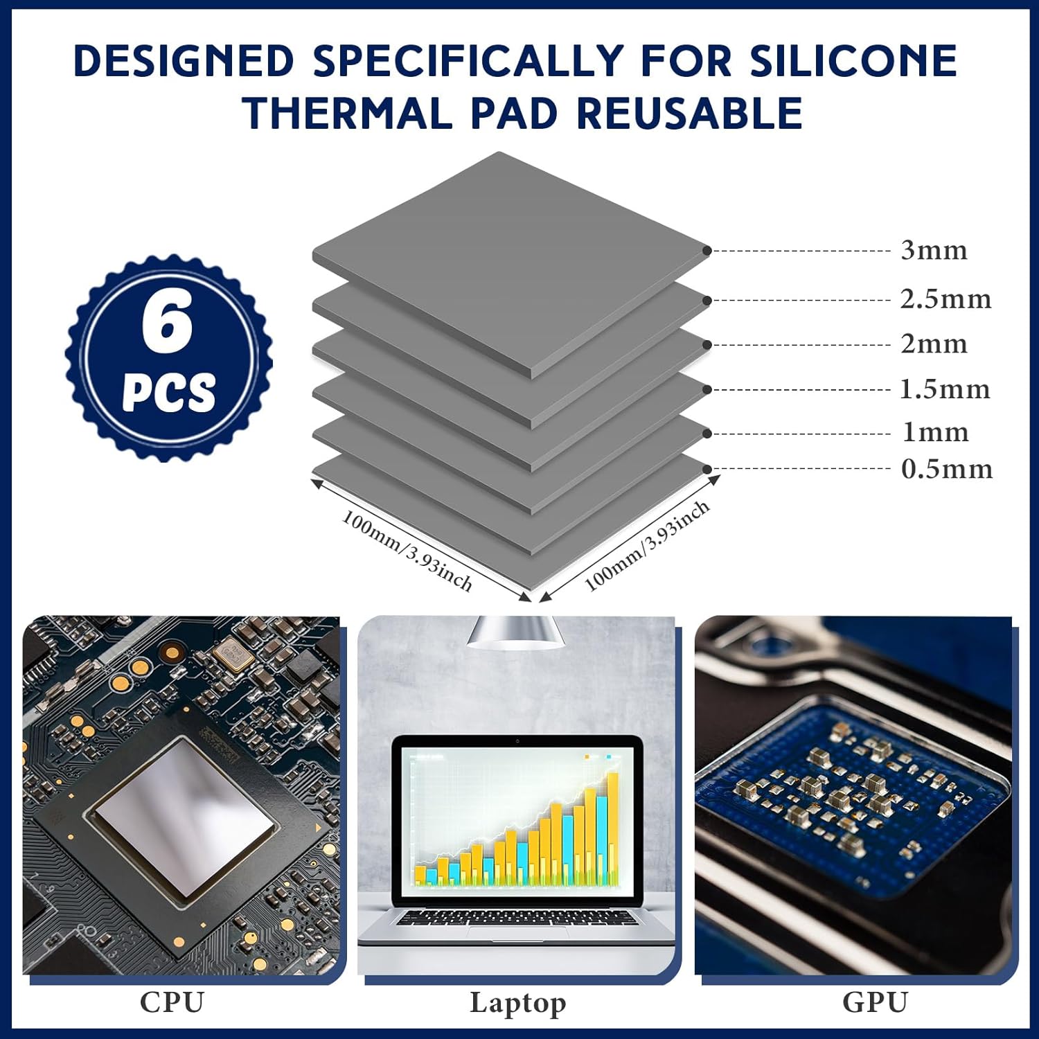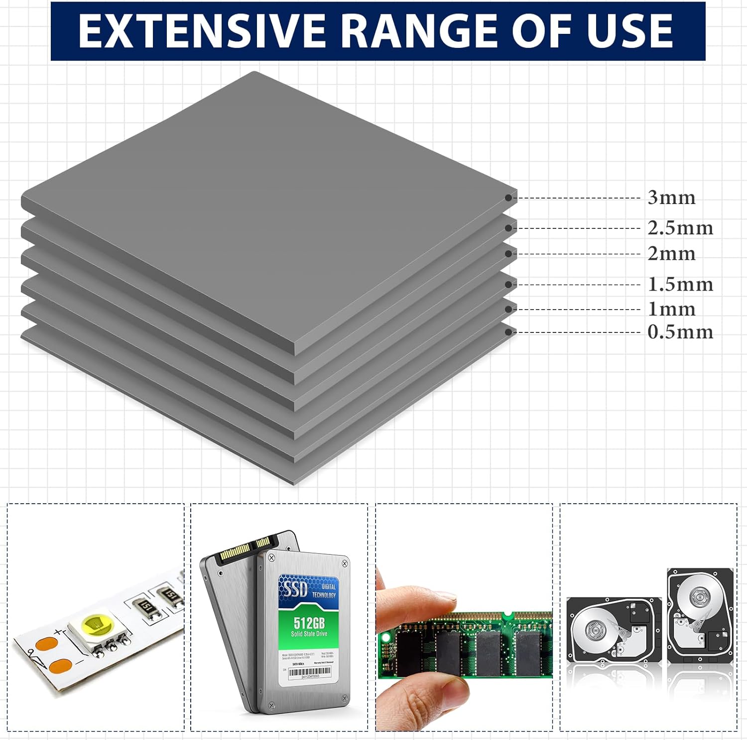 - Appropriate Size: thermal pads are about 100 x 100 mm, with a thickness of 0.5 mm, 1 mm, 1.5 mm, 2 mm, 2.5 mm, 3 mm, enough to meet different needs; Total 6 pieces, rich for filling the contact surface gap, practical for beginners and professionals assistant
