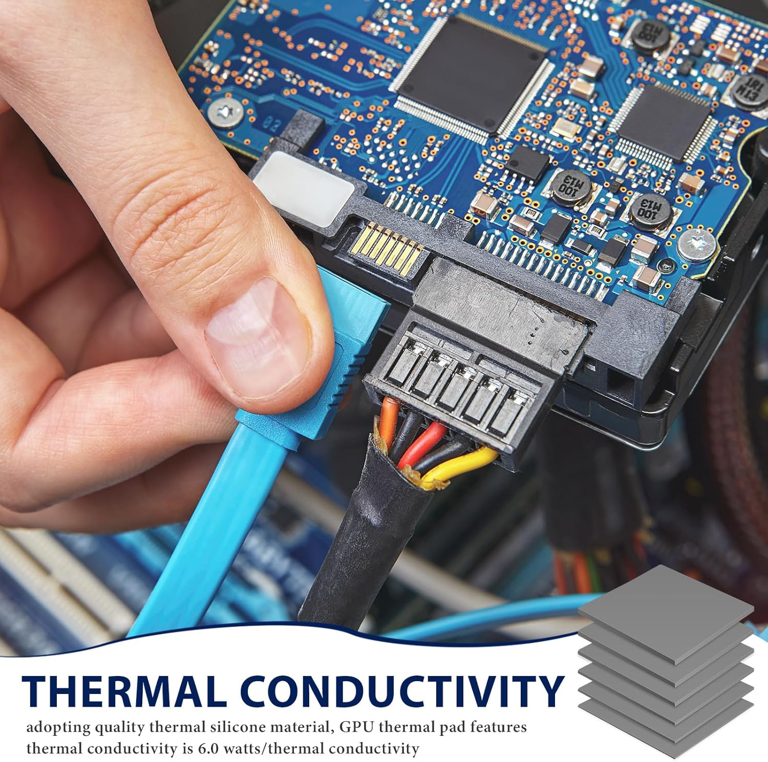 - Thermal Conductivity: adopting quality thermal silicone material, GPU thermal pad features thermal conductivity is 6.0 watts/thermal conductivity, which have nice performance to well improve the heat transfer between electronic components, and effectively cool down the temperature within seconds