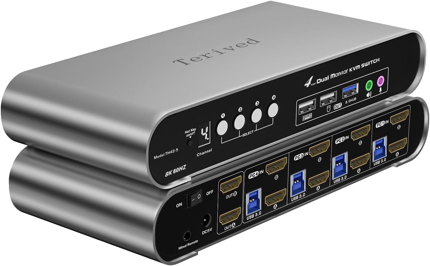 4 Computers 2 HDMI Monitor Automatic KVM Switch 8K@60Hz, Hotkey Switching, EDID, with Audio and Microphone, Aluminum Shell with Digital Display, USB 3.0 Hub, HDR10 with Cables