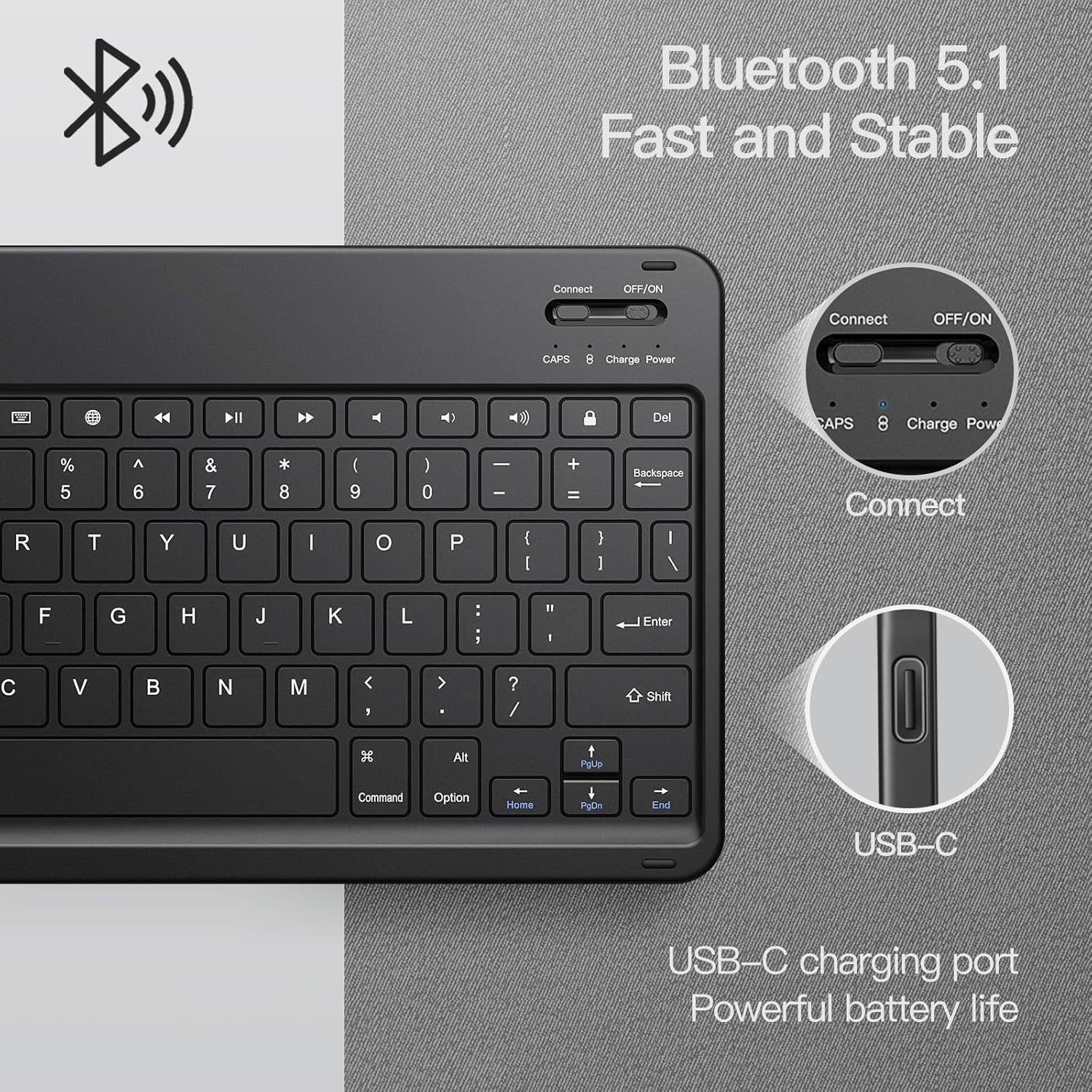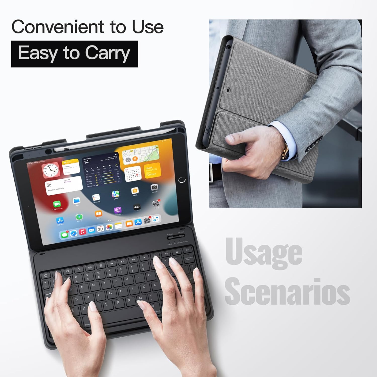 - [Magnetic & Detachable Keyboard] The keyboard with easy-to-operate keys and stable Bluetooth connection can be attached to the cover with strong magnets, instantly turning your iPad into a laptop mode to improve the efficiency of working, learning or gaming. No fear of a sudden slide and you can remove it when not in use