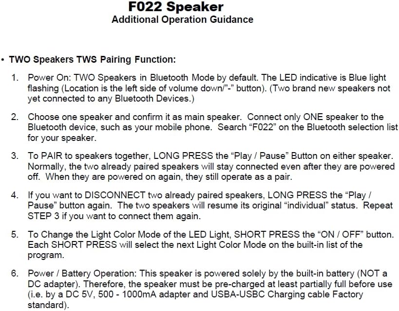 - REMARK: This speaker is powered by the battery (NOT a DC adapter). Therefore, the speaker must be pre-charged at least partially full before use (by a DC 5V, 500 - 1000mA adapter).