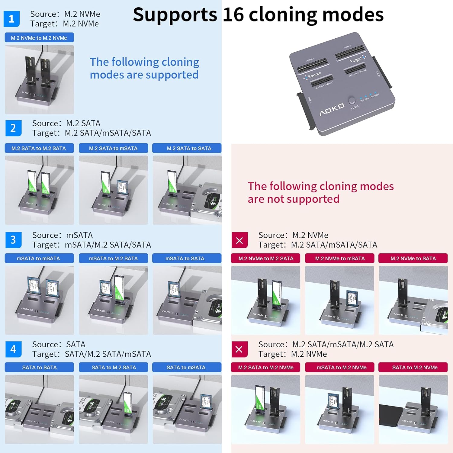 - Note: 1. Always back up important data before cloning to prevent potential data loss ; 2.Only supports same-protocol cloning:NVMe → NVMe, SATA →mSATA /SATA or M.2 SATA. do not connect to the computer during cloning!