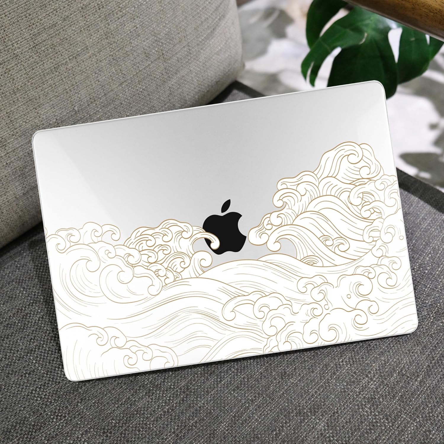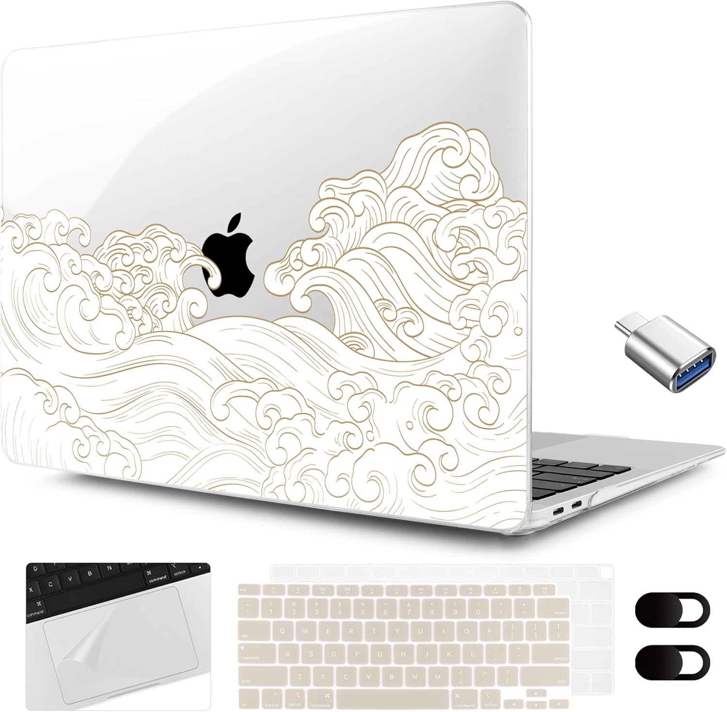MEEgoodo for MacBook Air 13.3 inch Case 2021 2020 2019 2018 A2337 M1 A2179 A1932, Laptop Shell with Keyboard Webcam Cover & Trackpad Film & Type C Adapter for MacBook Air M1, Hand Drawn Wave