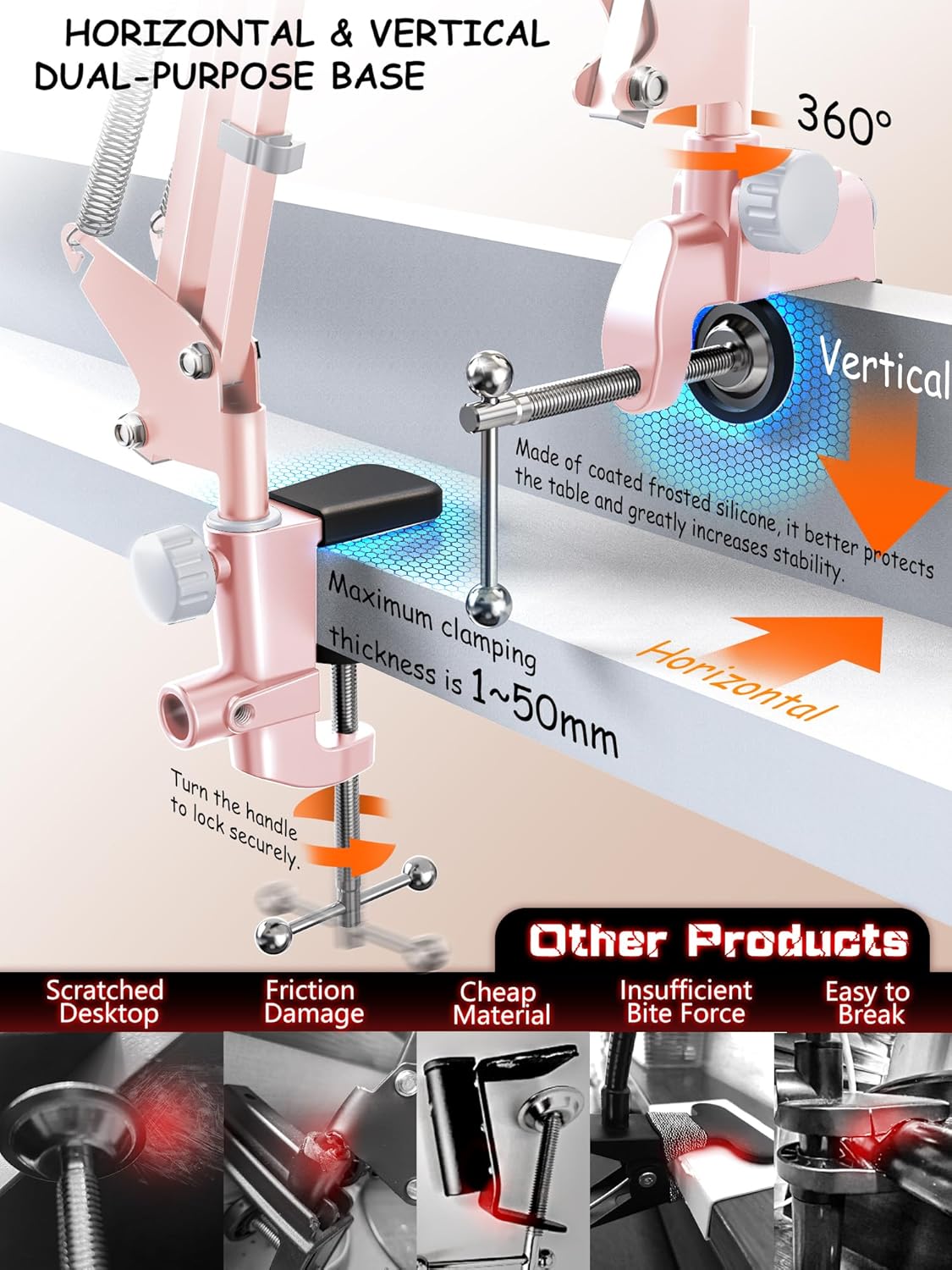 - ✹Base for vertical and horizontal use:The base is equipped with two jacks, which can realize the vertical and horizontal use of the stand, and it is equipped with a silicone mat, which will not damage your headboard, and has high stability during use. The base can firmly clamp the table, bedside and other installation surfaces by about 40mm. Installation requires no tools or holes.