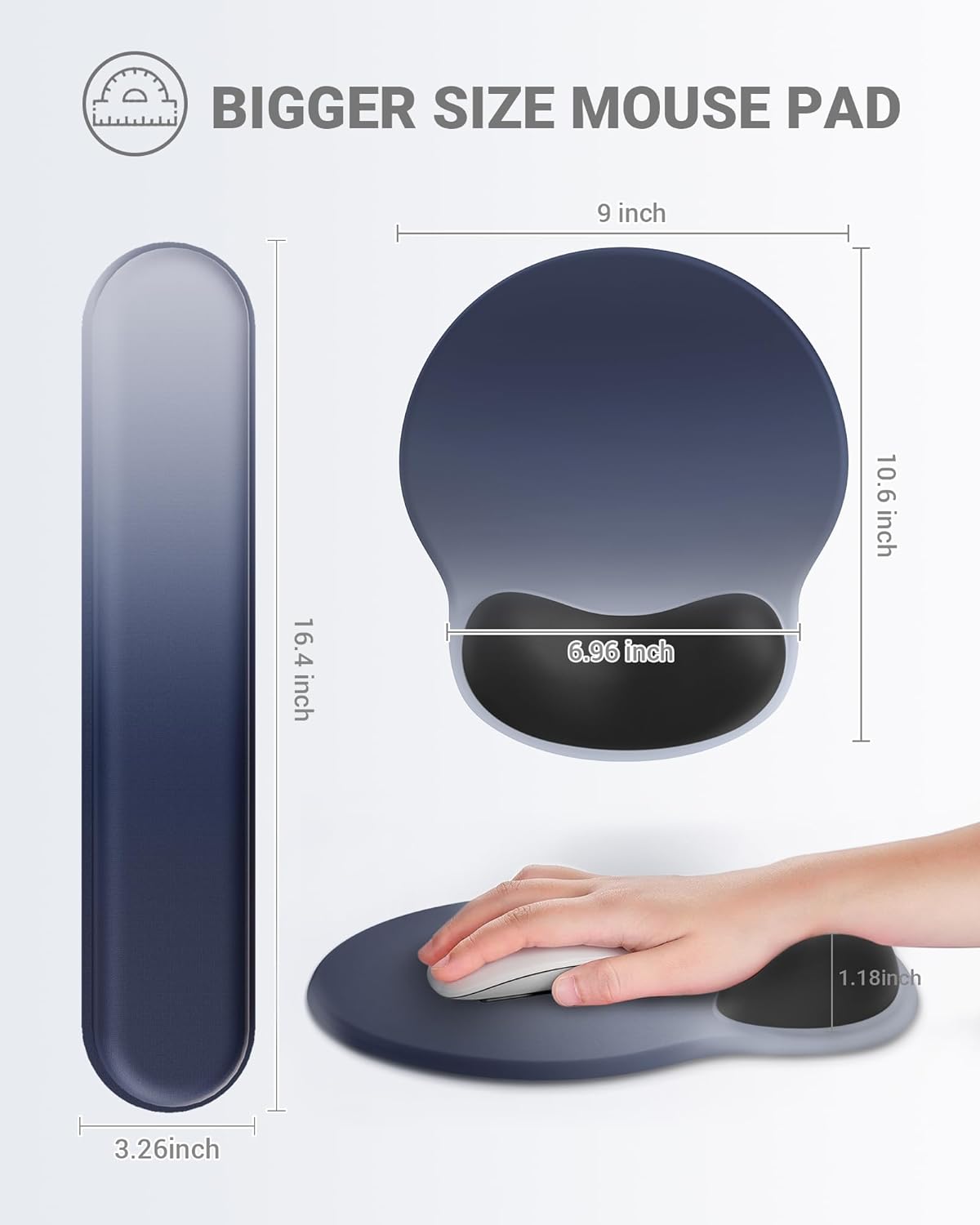 - 【Ergonomic Shape and Size】This 2-in-1 wrist rest set is designed for convenience, with a 16.4 x 3.26 inches keyboard wrist rest pad and a 10.6 x 9 inches mouse pad with a 1.18 inch thick wrist rest. You can move the mouse around more easily and freely. Good for working, gaming, or as gifts to your friends or family. (Note: Please make sure the desk has enough space for mouse pad set.)