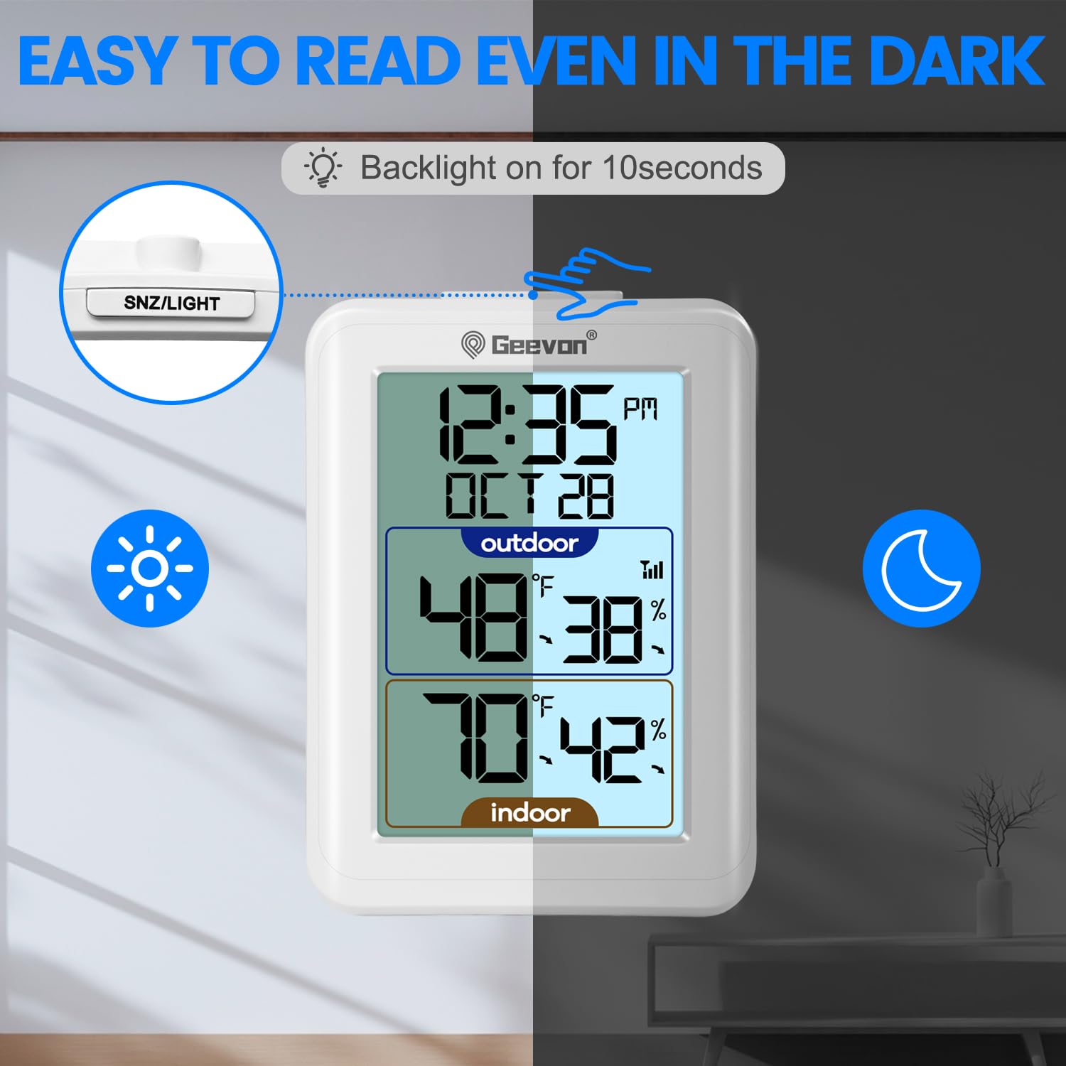 Geevon Digital Hygrometer Indoor Outdoor Thermometer Wireless with Clock, Backlight Temperature Gauge Humidity Monitor, Inside Outside Thermometer with 200ft/60m Range Remote Sensor,White