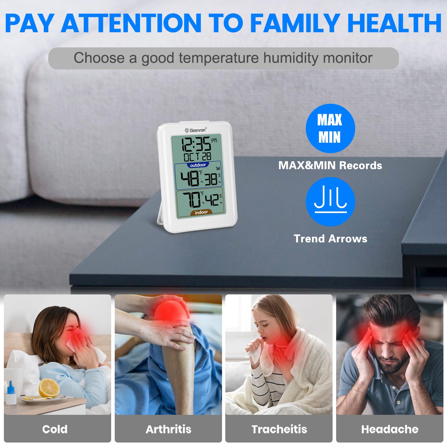 - 【Accurate Temp & Humidity Readings】 Geevon inside outside thermometer wireless with strong signal penetration temperature/humidity sensors,capable of connecting up to 3 channels wireless sensor up to 60m/200ft for multiple locations in an open area.(Additional sensor can be ordered).