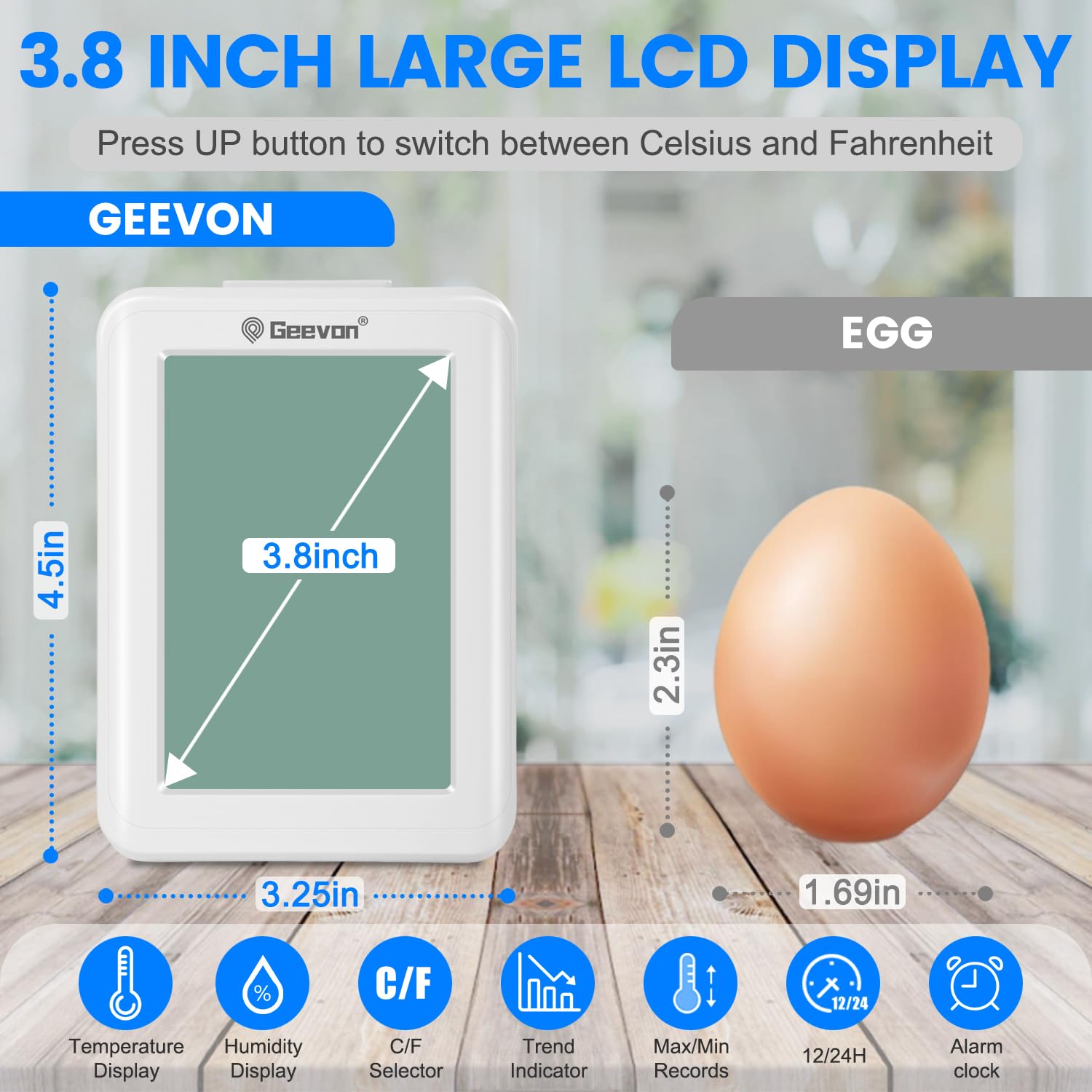 - 【Easy to Read Backlit Thermometer/Clock】3.8 inches large lcd display features backlit screen, 10 seconds auto-off, making the wireless thermometer weather hygrometers with time easier to read in dim light conditions.Note: the backlight can not always on, it will AUTO turn off after 10 seconds to save energy.