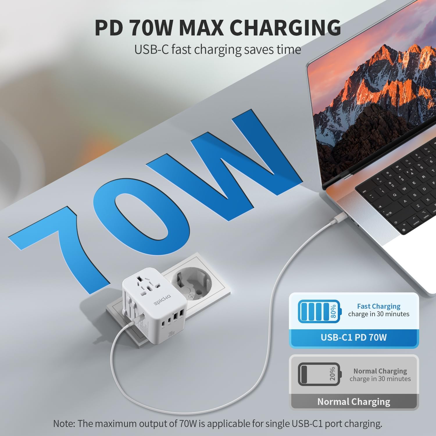 EPICKA Universal Travel Adapter, GaN International Plug Adapter with 3 USB-C 70W PD Fast Charging & 2 USB-A Adaptor All-in-one Wall Charger for USA EU UK AUS (TA-105 Pro, White)