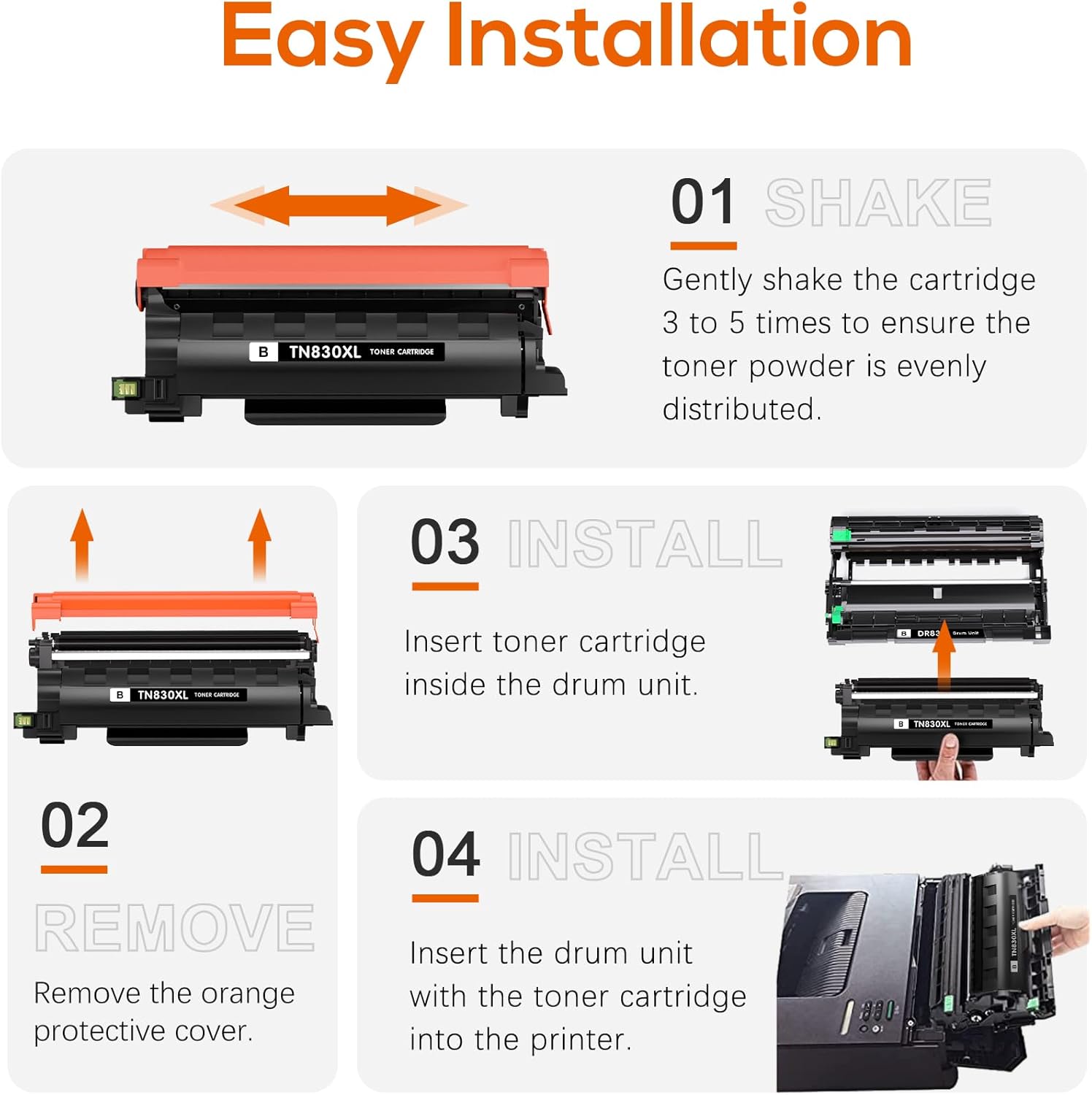 - Simple Installation: Engineered for effortless installation, our TN830XL toner enables users to replace cartridges seamlessly and resume printing without any inconvenience.