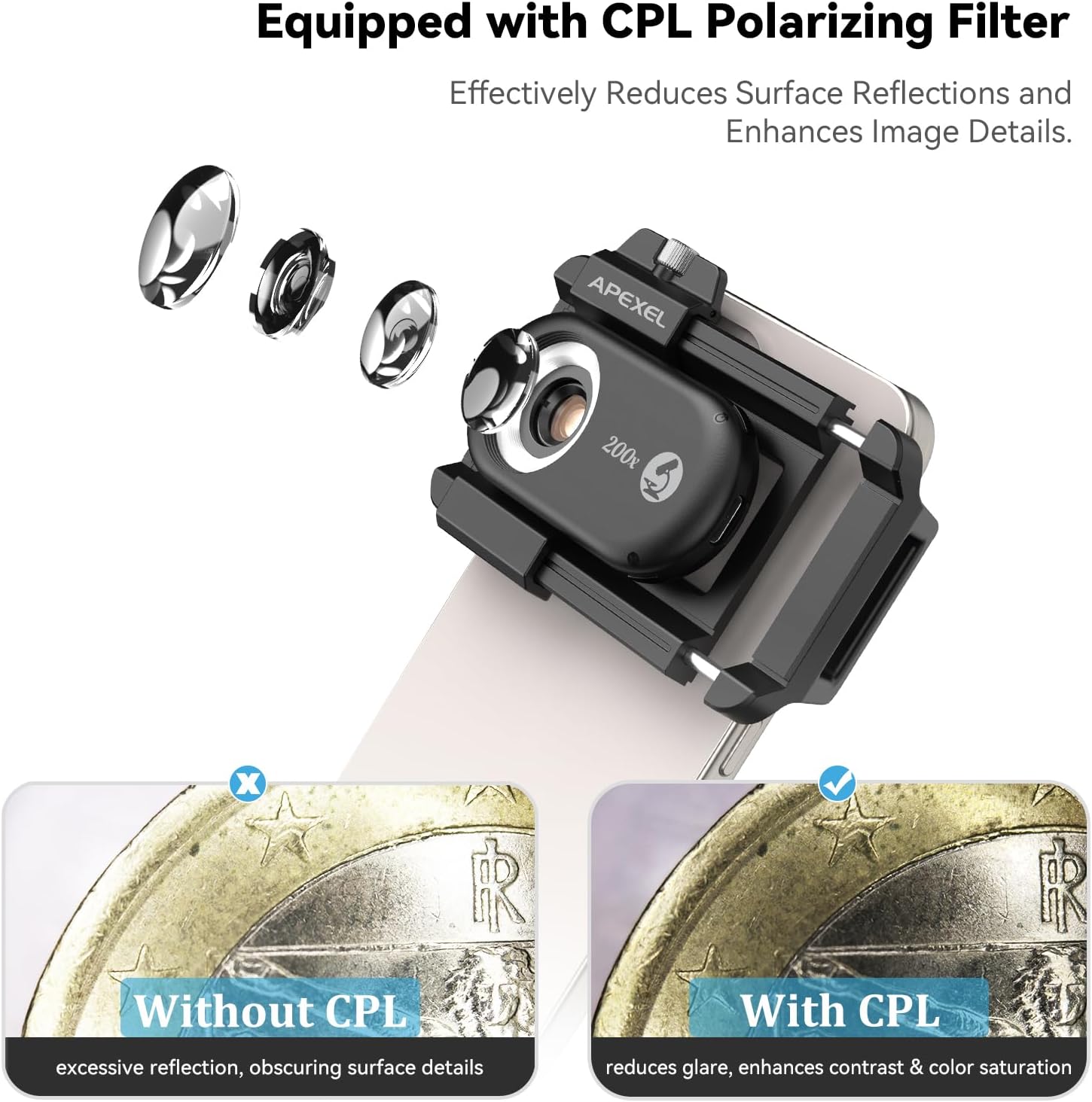 - 🔬【100X-200X HD Magnification】Transform your smartphone into a microscope with APEXEL phone microscope lens. You can buy single lens at different magnification levels(100X/150X/200X), or choose our 3-in-1 package. The revolutionary slide rail and modular design design allow you to switch quickly. Our coins microscope lens offers breathtaking, high-definition imagery every time. (The optimal working distance between the lens and the subject is 6-10mm.)