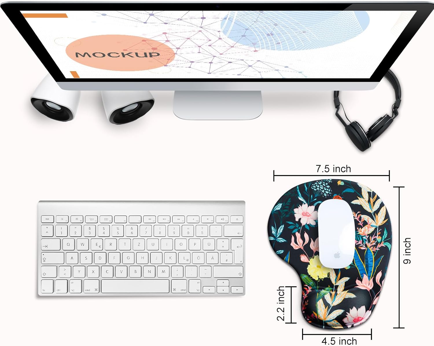 JIKIOU Mouse Pad, 2 Pack Ergonomic Mouse Pads with Comfortable Gel Wrist Rest Support and Smooth Cloth, Non-Slip PU Base for Easy Typing Pain Relief Durable and Easy to Clean Small Black Flowers