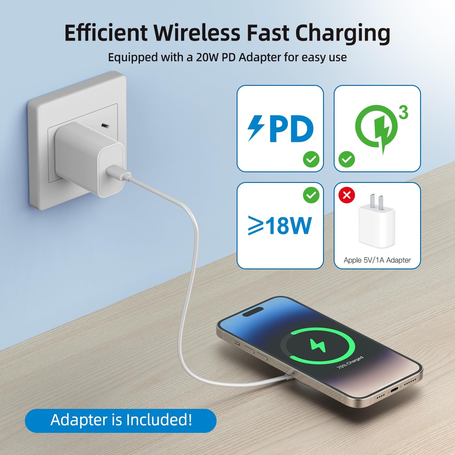 - 🔌【20W Type-C Adapter Included】This wireless charger pad is simple to use and comes with a 20W PD adapter for fast charging. With three times the charging speed of a 5W charger, our upgraded charger delivers rapid and consistent charging. Experience the superior efficiency of our magnetic wireless charger.