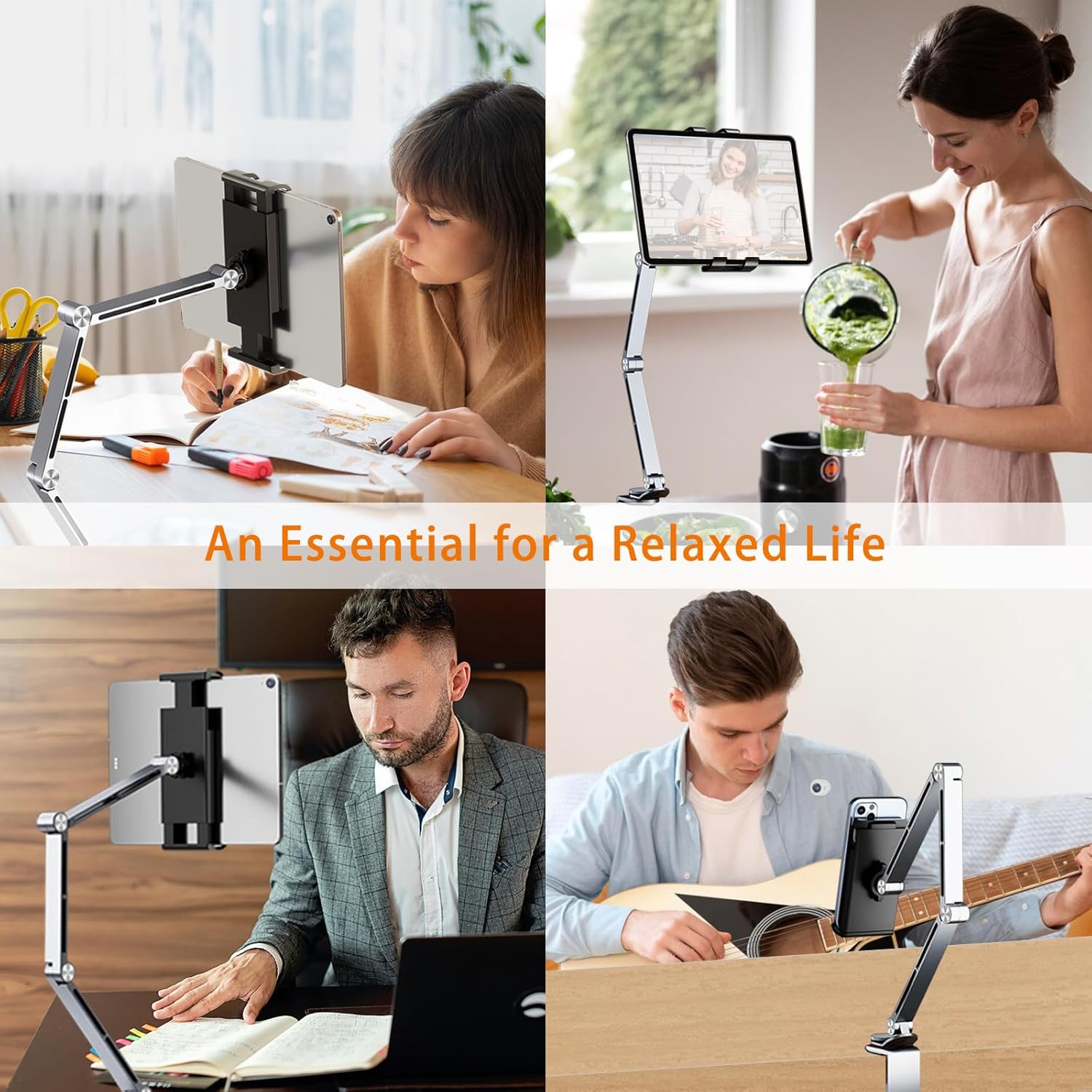 - 【FULLY ADJUSTABLE DESIGN】Featuring a 3-section long arm and 360° rotating base, this tablet holder mount offers greater flexibility and longer reach. It bends and rotates for the perfect viewing angle, whether you're standing, sitting, or lying down. Ideal for watching movies, gaming, reading, or cooking.