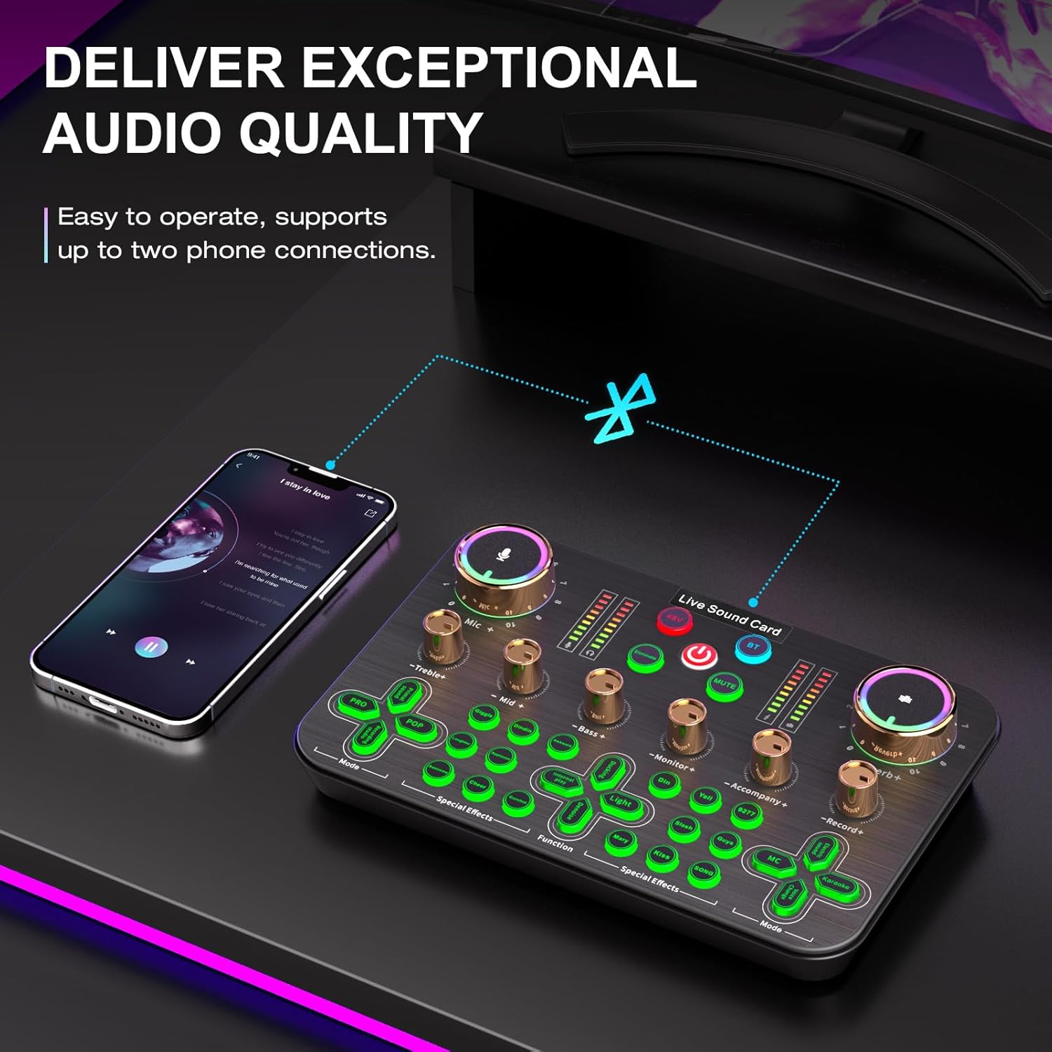 - 【Package Included】-- The audio mixer podcast kit for live broadcast includes: Sound Mixer Board x1, 3.5mm Audio Cable x2 , Data Cable x1, Use Manual x1. The design of the soundcard sound and button panel makes it simple and easy to use, ideal for beginners or intermediate podcasters. And, we offer 1-year guarantee period. If you have any questions or concerns, please don't hesitate to contact us.