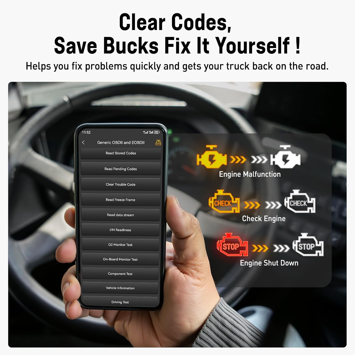 - Regain Power, Save Thousands: The HD110 modern semi-truck scan tool’s DPF Regeneration clears clogged filters in minutes! Stop paying for costly shop visits—perform on-demand DPF regen directly from your cab, anytime and anywhere. This diesel scanner diagnostic tool works with all major engines (Detroit, Paccar), including DPF regeneration tools to keep your truck running strong, boost fuel efficiency, and avoid breakdowns. Don’t let a clogged filter stop you—get back on the road faster