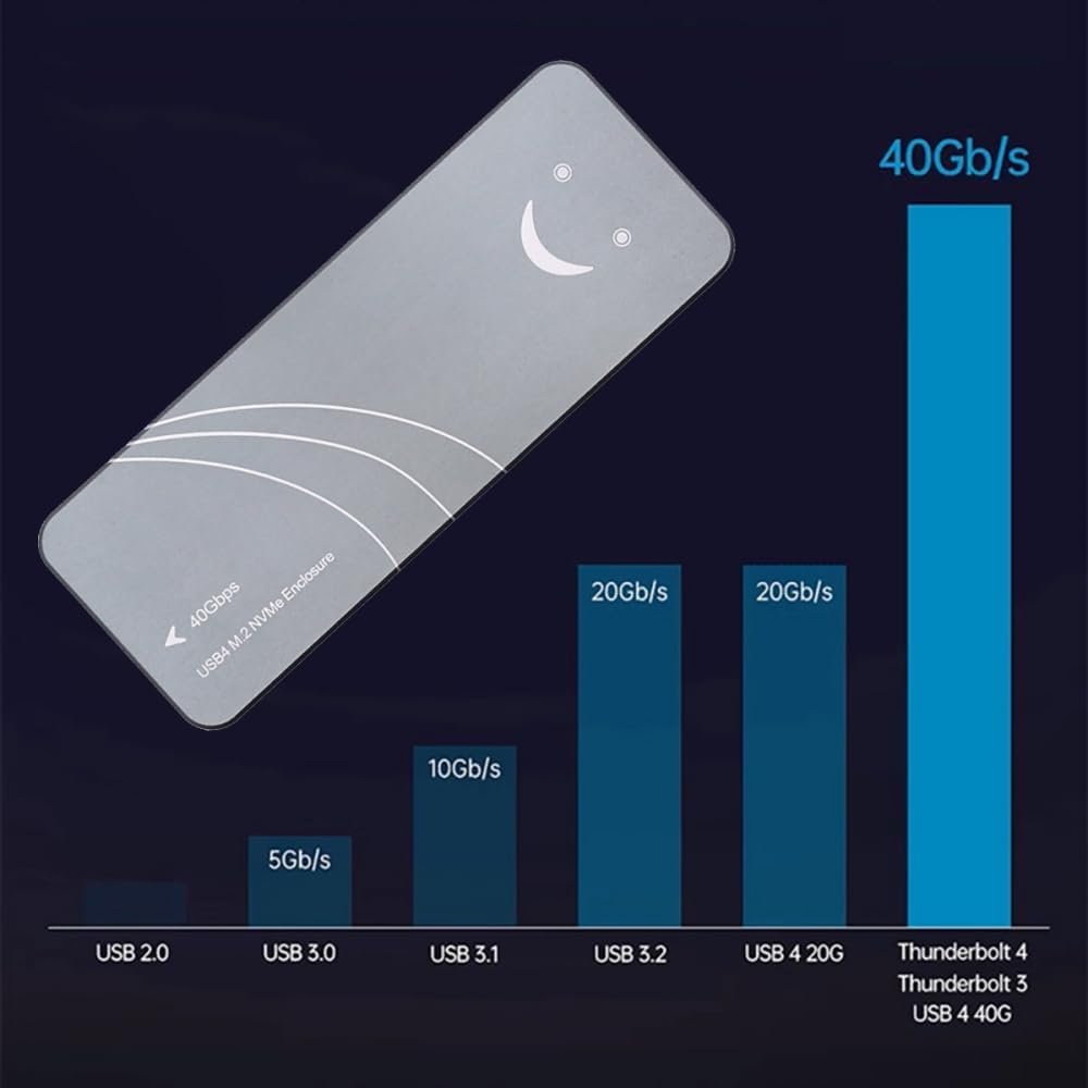 - Multiple Transmission Protocols:The USB 40G M.2 Enclosure is compatible with multiple transmission protocols and interfaces, ensuring broad adaptability. It supports USB 4 / Thunderbolt 3 / Thunderbolt 4 with a maximum transmission rate of 40Gbps. Due to protocol conversion losses, the theoretical maximum read speed is 3200Mb/s, and the theoretical maximum write speed is 3200Mb/s. In the USB 3.2 Gen 2X2 20G protocol, the maximum speed reaches 20Gbps.