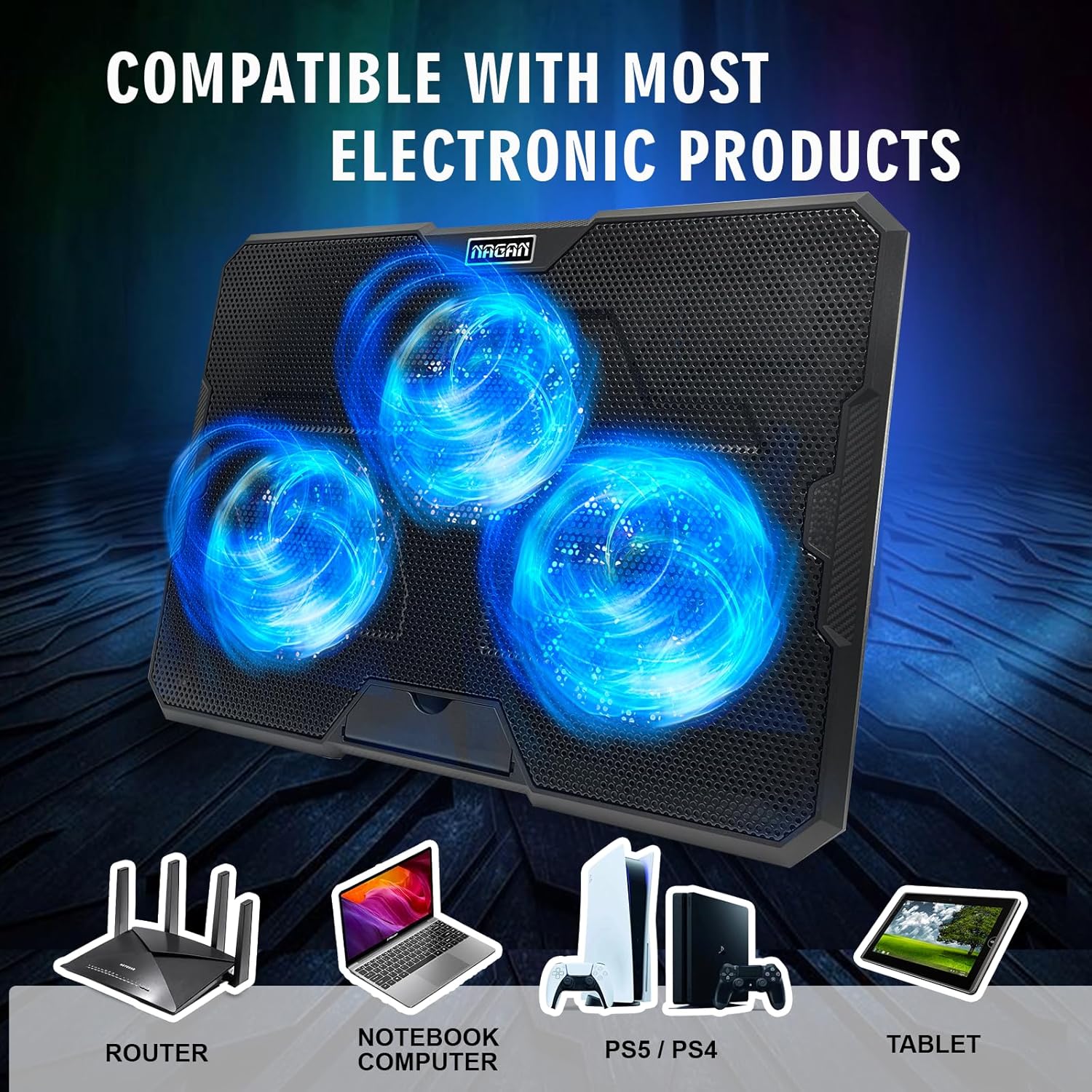 - 【Keep Your Laptop Cool】 NAGAN Laptop Cooling Pad with 3 powerful fans keeps your laptop cool and prevents overheating. The fans are fairly quiet, so you won't be disturbed while working or gaming.