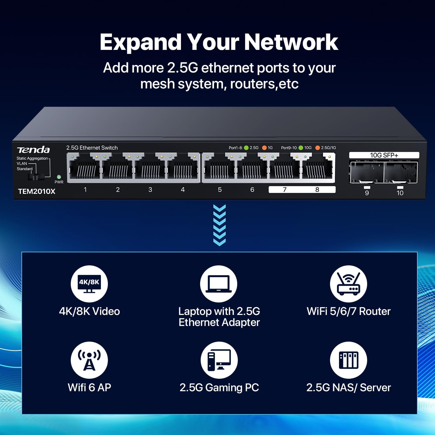 - γπ§ππ₯ππ-π π’ππ π§π’ππππγTenda unmanaged 8 port 2.5G ethernet switch support three modes of Standard, VLAN and Static Link Aggregation, flexible for 2.5G WiFi 6 AP, 2.5G/ 5G/ 10G NAS, 2.5G/10G PCIe Adapter, 2.5G/10G Server, Gaming Computer, 4K/ 8K Video, LAN Party or SOHO PRO Users,etc