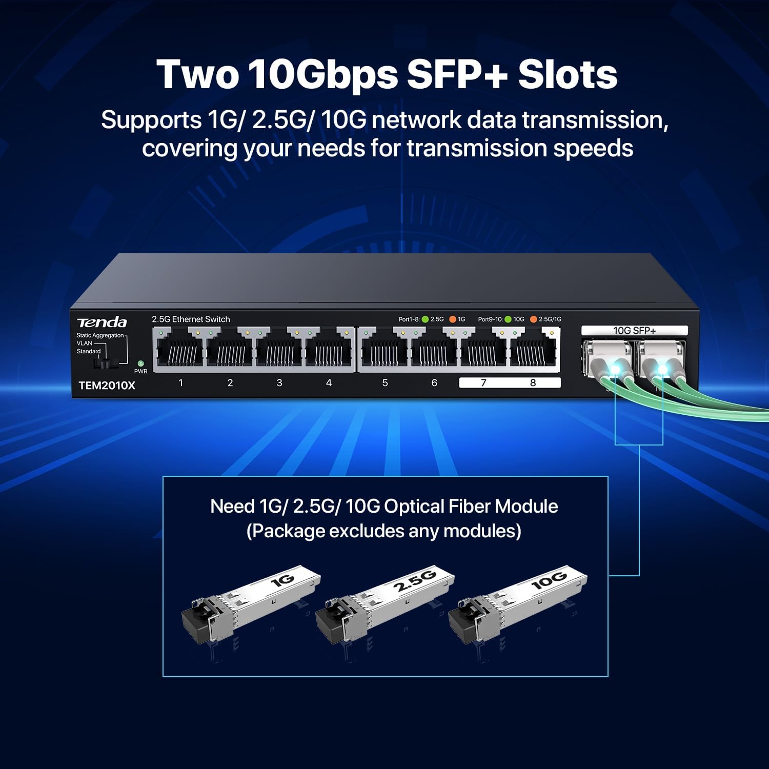 Tenda TEM2010X 8 Port 2.5G Ethernet Switch, Unmanaged 2.5Gb Switch with 8 x 2.5G Ports & 2 x 10Gb SFP+ Slots, Support VLAN & Static Link Aggregation, 80Gbps Switching Capacity, Fanless Metal Design