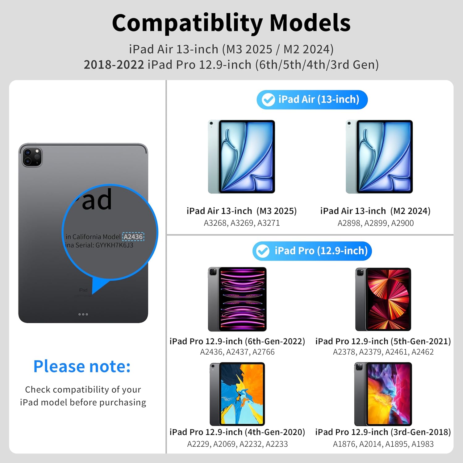 - Compatible Devices : iPad Air 13 inch (M3 2025 / M2 2024) and iPad Pro 12.9 (6th, 5th, 4th, 3rd Generation)