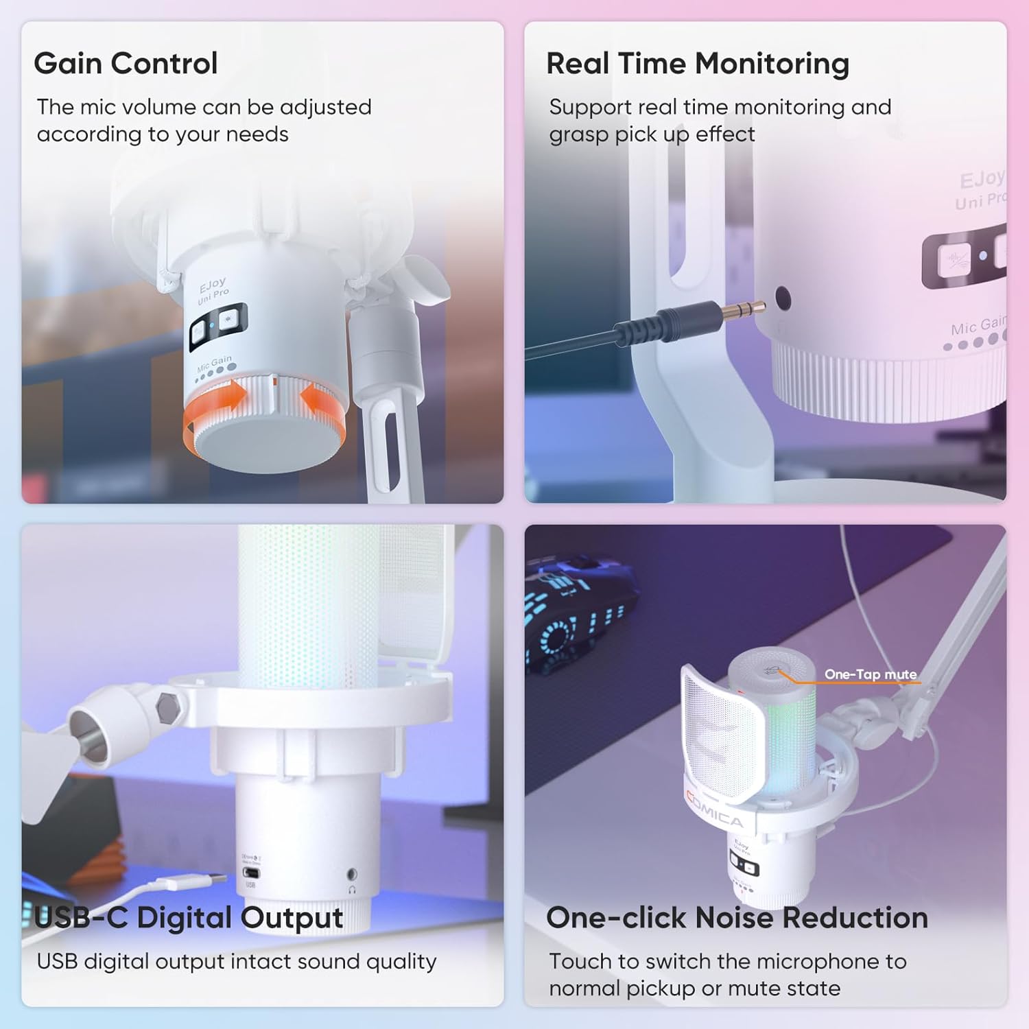 Comica EJoy Uni Pro Wireless USB Condenser Gaming for PC, PS4, PS5, USB C Phone and Mac, Boom Arm RGB Computer Mic for Twitch, Streaming, Podcasting, Noise Cancellation Mic with Mute, Gain, Monitoring