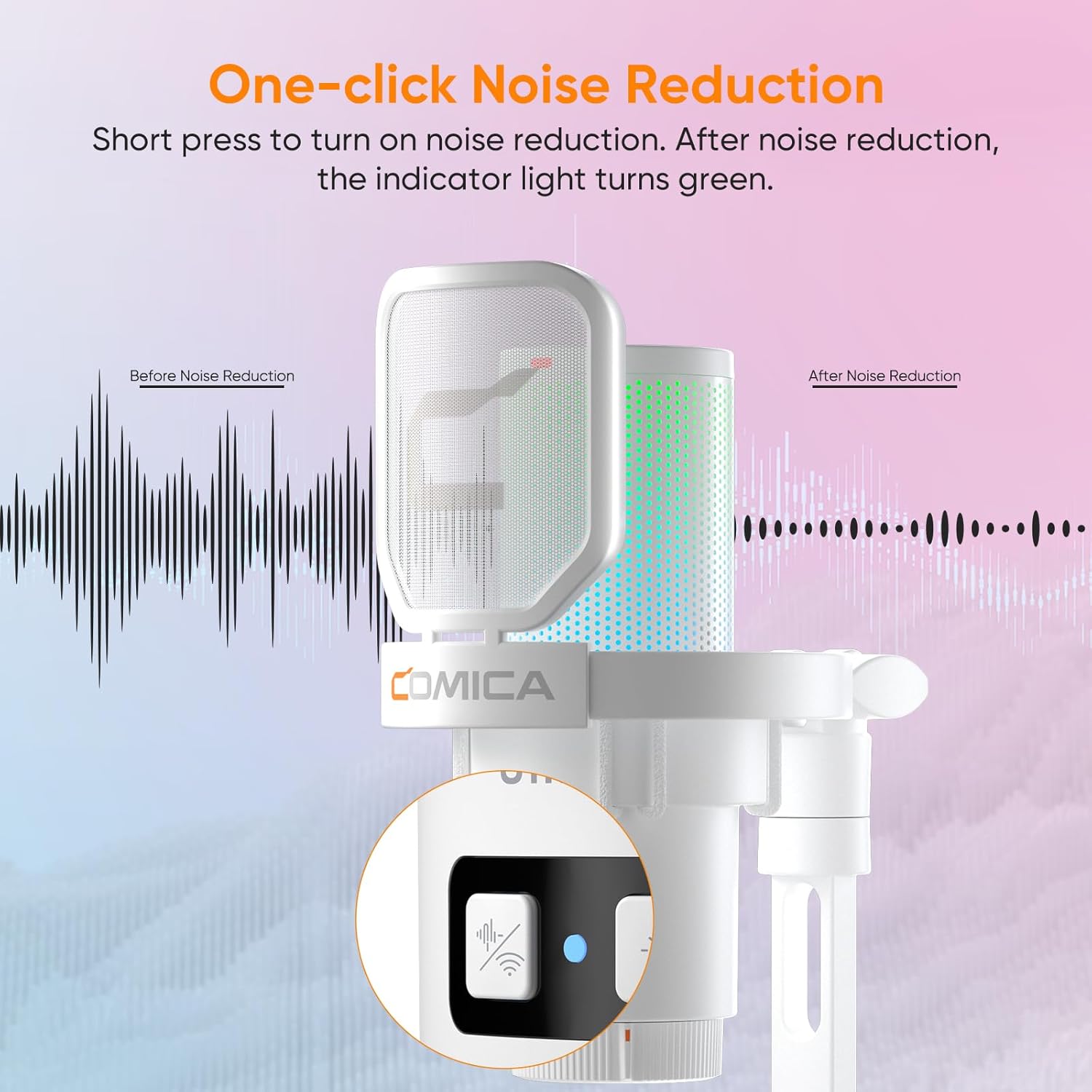 - 【Effective Noise Canceling】One-click denoise feature minimizes background noise for a pure recording experience;The equipped shock-mount can reduce the vibration caused by accidental collisions effectively and keep distance from noise; the metal pop filter can filt the air flow noise and avoid the appearance of ejectives.