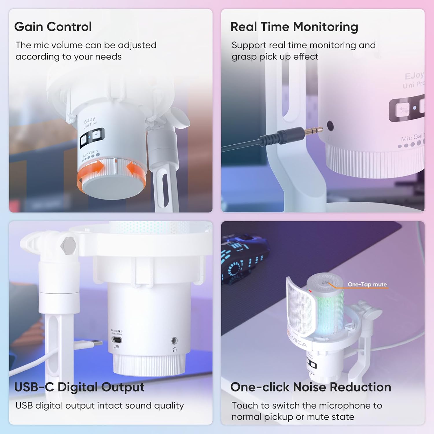 - 【Controllable Dynamic Radiant RGB Lighting with 3 Unique RGB Effects】 Ejoy Uni Pro wireless gaming microphone features dynamic RGB lighting effects including breathing light, dynamic gradient, and audio dynamics, adding visual appeal to your gaming and live broadcasts to attract more viewers.