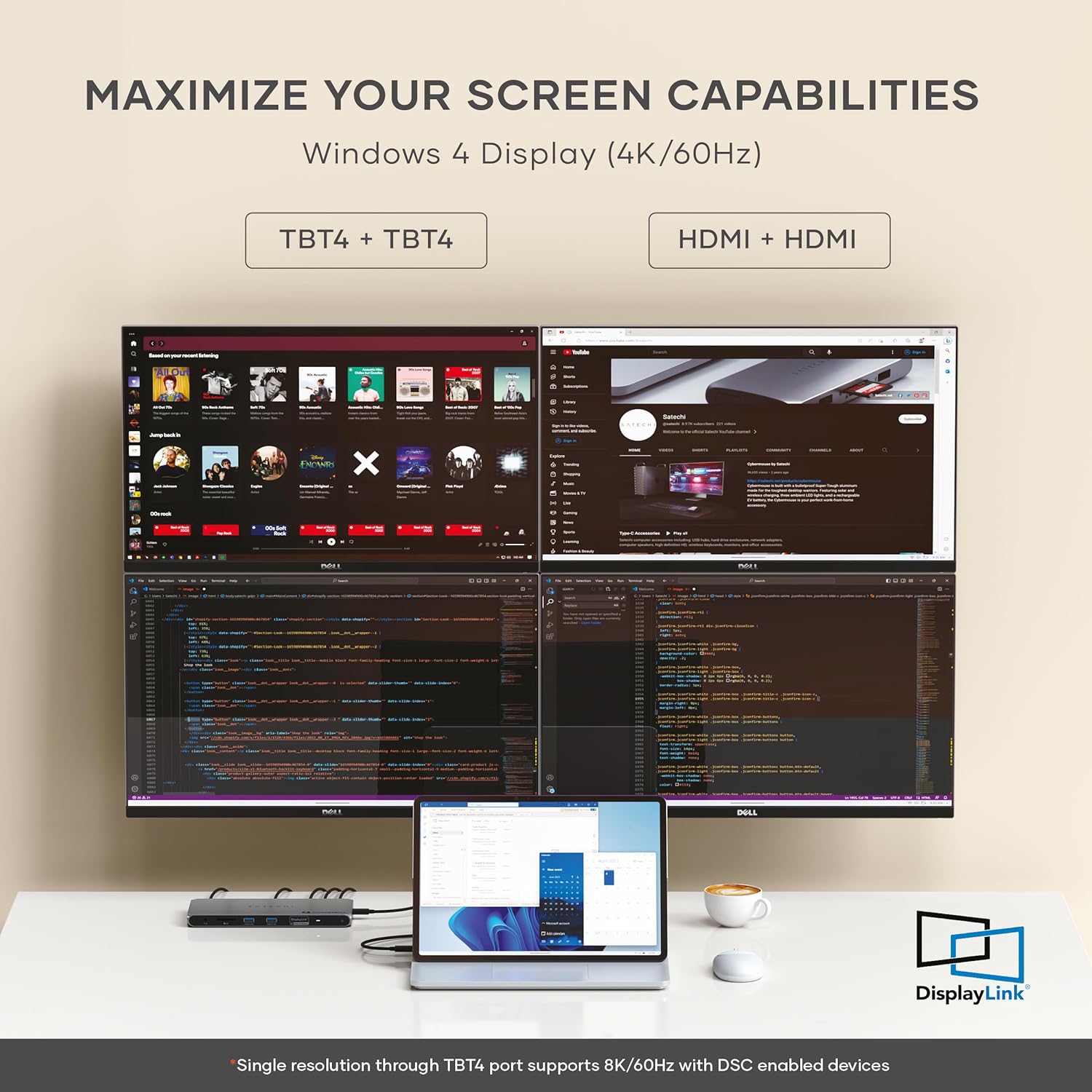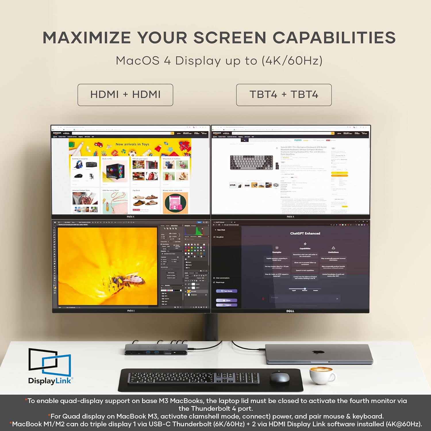 - Multiply Display Capabilities – Supports up to 4 external extended displays at 4K/60Hz, 2 via thunderbolt 4 ports and 2 via HDMI (DisplayLink required). Limited to 3 external extended display for Mac M2/M1 processors, 1 via Thunderbolt 4 port and 2 via HDMI ports. Note: Requires installation of DisplayLink Drivers before using.