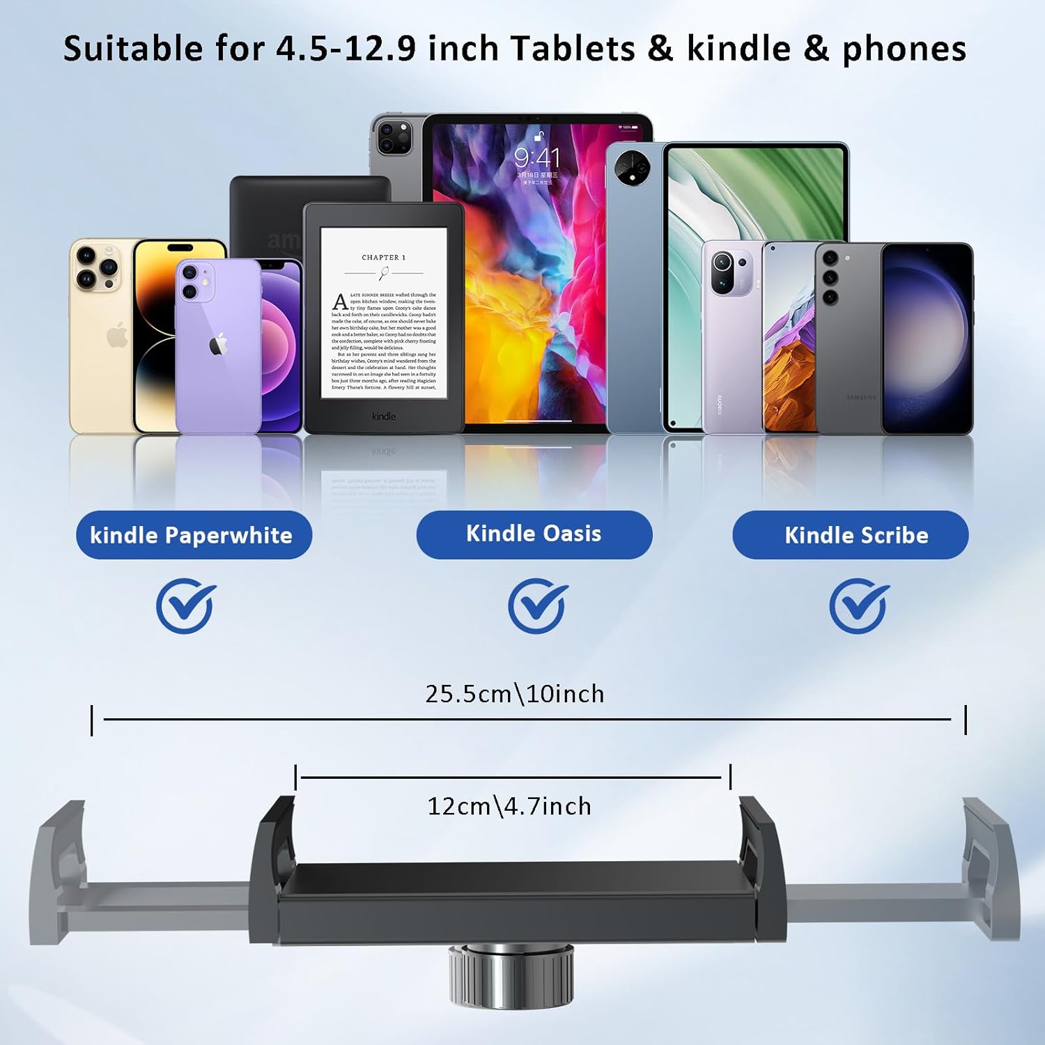 - 【 Save Space 】 The stand no need tools for installation, it is a flat base, you can put the base under the bed or sofa which save much space for your reading, watch phone/tablet tiktok video, live stream, video recording