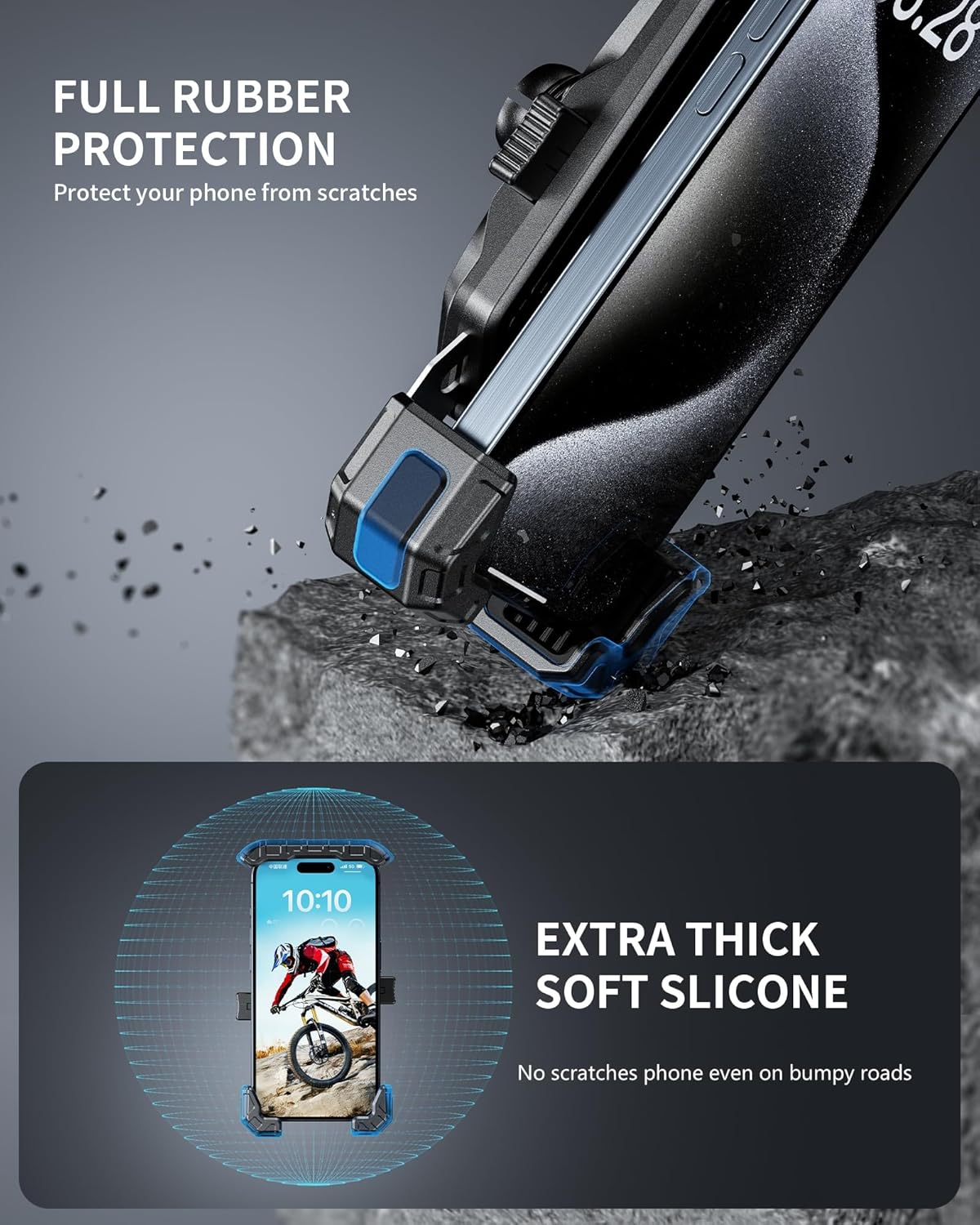 - Shockproof, Protects Phone Camera: The four corners of the motorcycle phone holder are covered with cushioned rubber pads that fully encase your phone, preventing scratches and vibration. Our phone mount for motorcycle are non-contact design between the mount and phone camera prevents pressure and scratches on the camera during rides, let you worry-free journeys riding