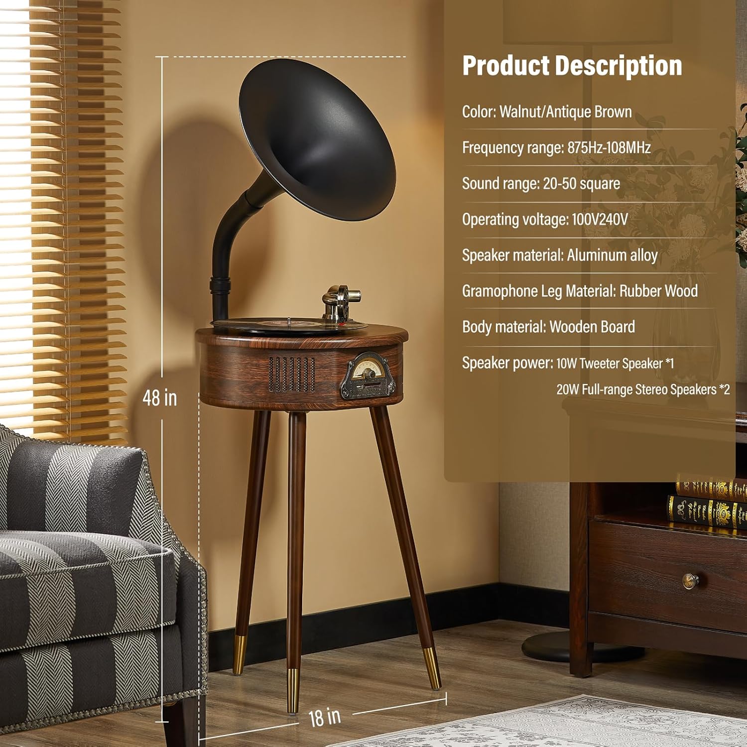 - [Classic Italian style Gramophone]: The product undergoes 6 rounds of hand-polishing to ensure exceptional smoothness. It features 16 layers of environmentally friendly paint, resulting in a delicate and captivating surface gloss. The classic Italian design combines wood materials and metal decorations perfectly, with three slender wooden legs supporting a top black horn speaker, adding an elegant retro charm.