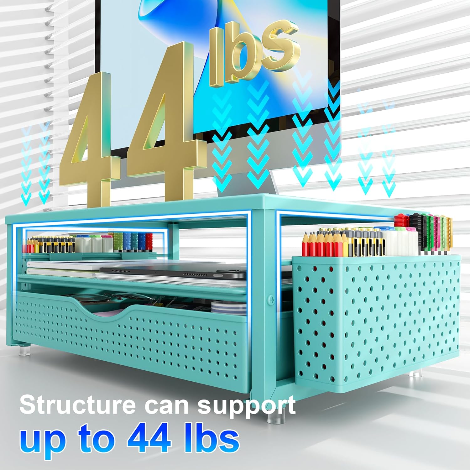 gianotter Desk Organizers and Accessories, Monitor Stand with Drawer and 2 Pen Holder, Desktop Organizer Suitable for Offices and Dormitories (Blue)