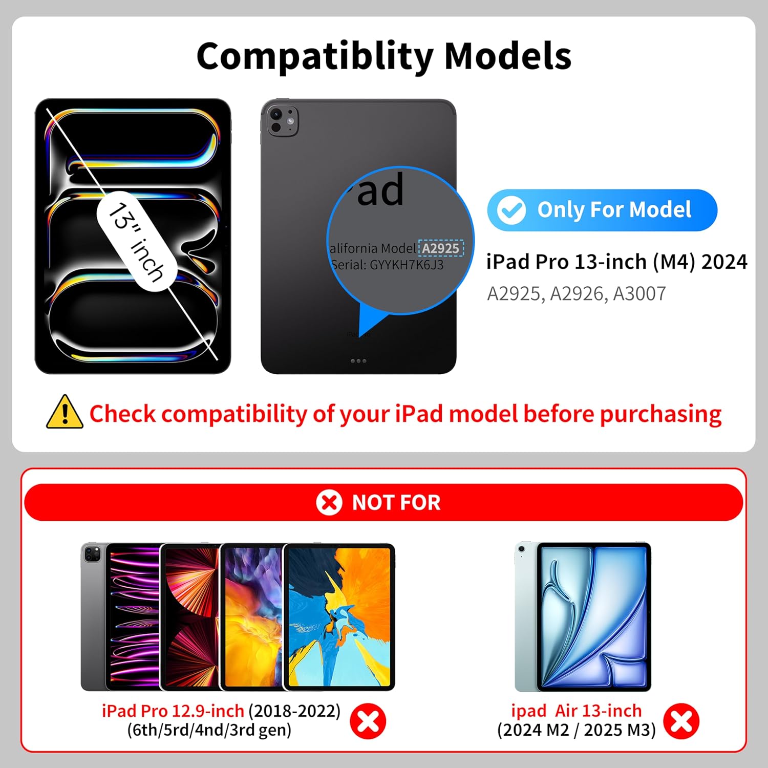 - 【Only Compatible】This multi-functional magic keyboard case is only compatible with iPad Pro 13-inch (M4) 2024 (Model: A2925, A2926, A3007). Note: Not for iPad Air 13-inch (M3 / M2) and iPad Pro (12.9-inch) (6th,5th,4th,3rd generation)