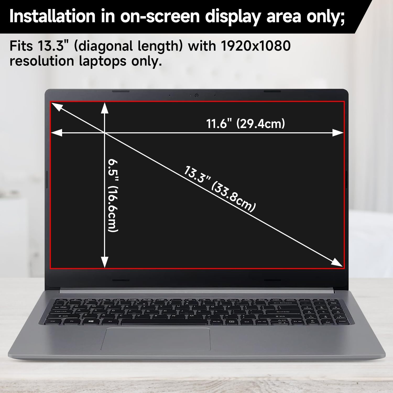 - 【Compatibility】This laptop privacy screen filter is specially design for 13.3 inch with Aspect Ratio 16:9 laptops (Not for 16:10 aspect ratio) -DIAGONALLY MEASURED 13”. The filter size (L x W) is 11.6 inch (29.4cm) x 6.5 inch (16.6cm). Please confirm your laptop model before purchasing. Also not fit for Any MacBook.