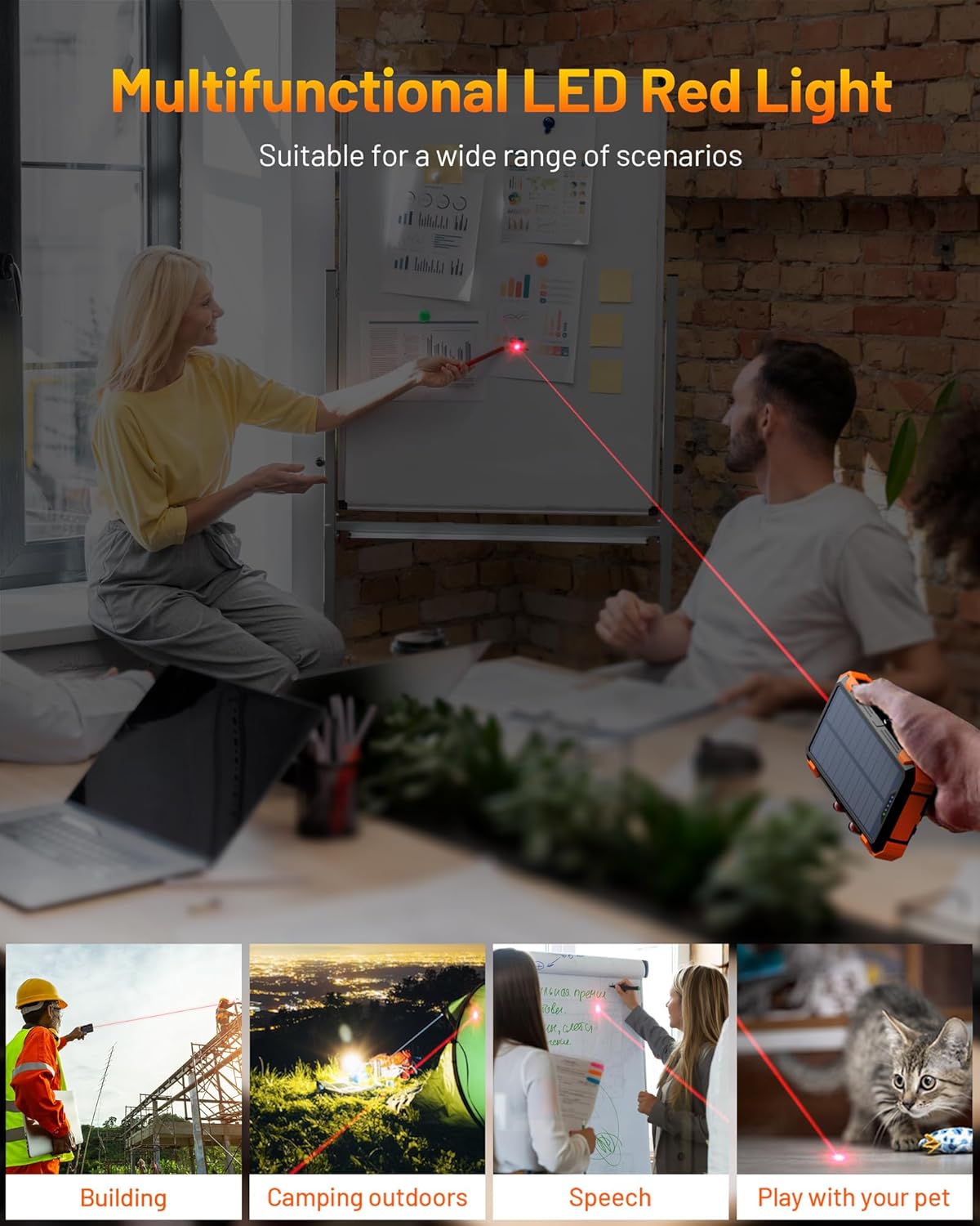 - Innovative and Practical Design : Our solar charger features a multi-functional LED red light pointer and a physical thermometer, adding a touch of versatility to your outdoor experiences. Use the laser pointer for presentations, signaling, or interacting with pets. The thermometer allows you to monitor indoor and outdoor temperatures without draining power, preventing overheating and battery damage risks