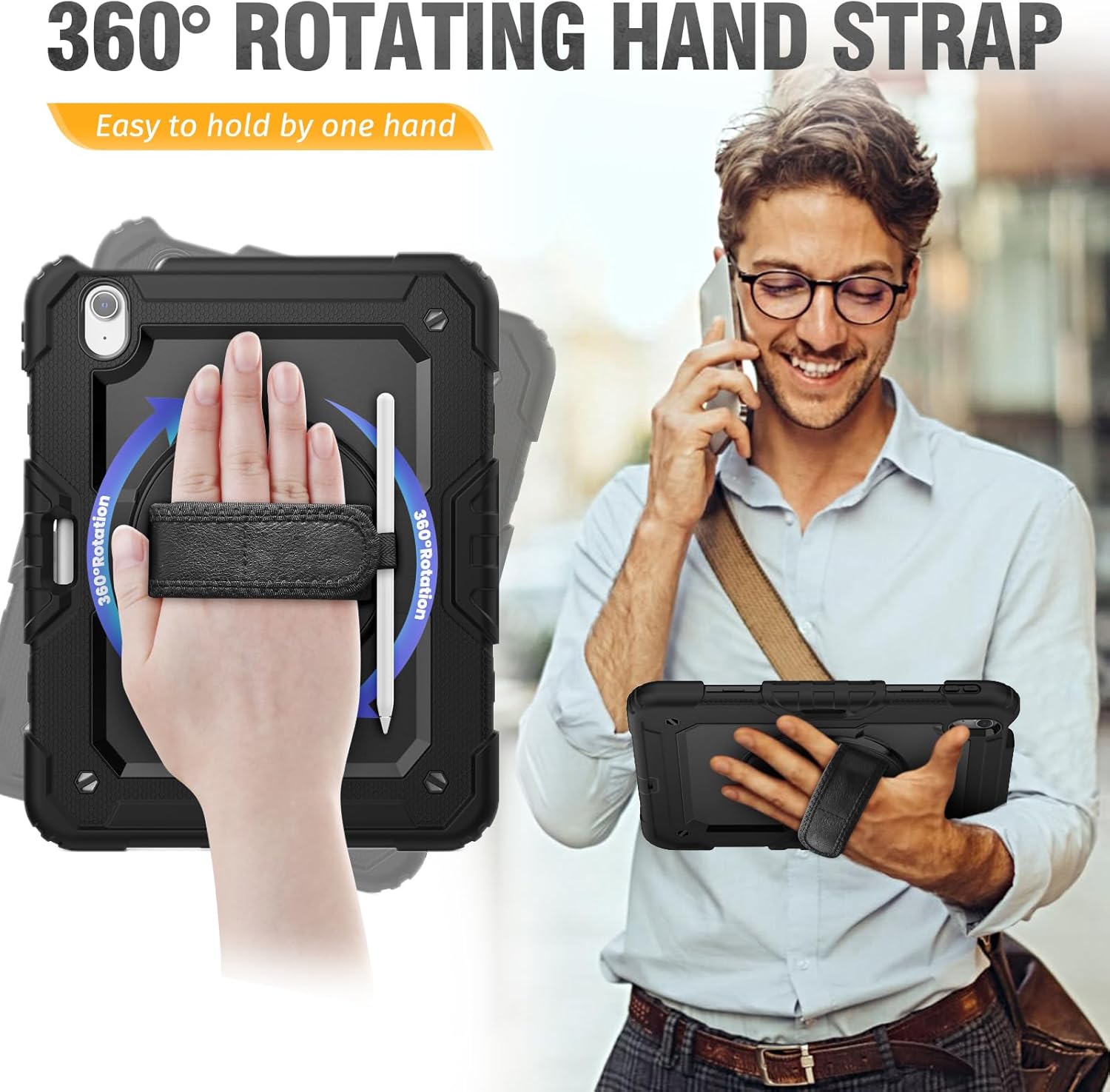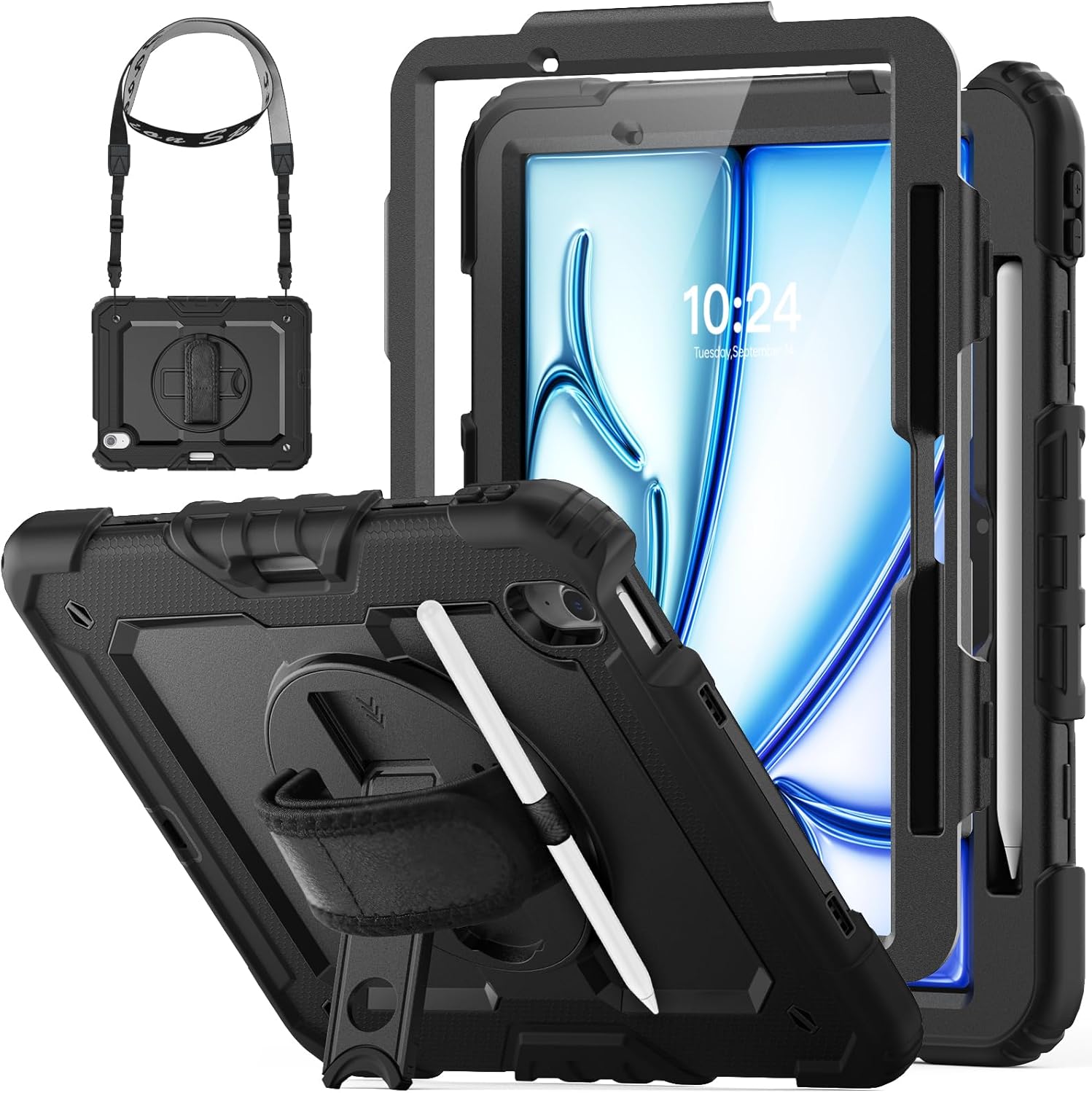 HXCASEAC Case for iPad Air 11 inch (2025 M3 / 2024 M2), Shockproof Design with Pencil Holder/Screen Protector/Rotating Hand Strap, Protective Cover for iPad Air 7th/6th Generation - Black