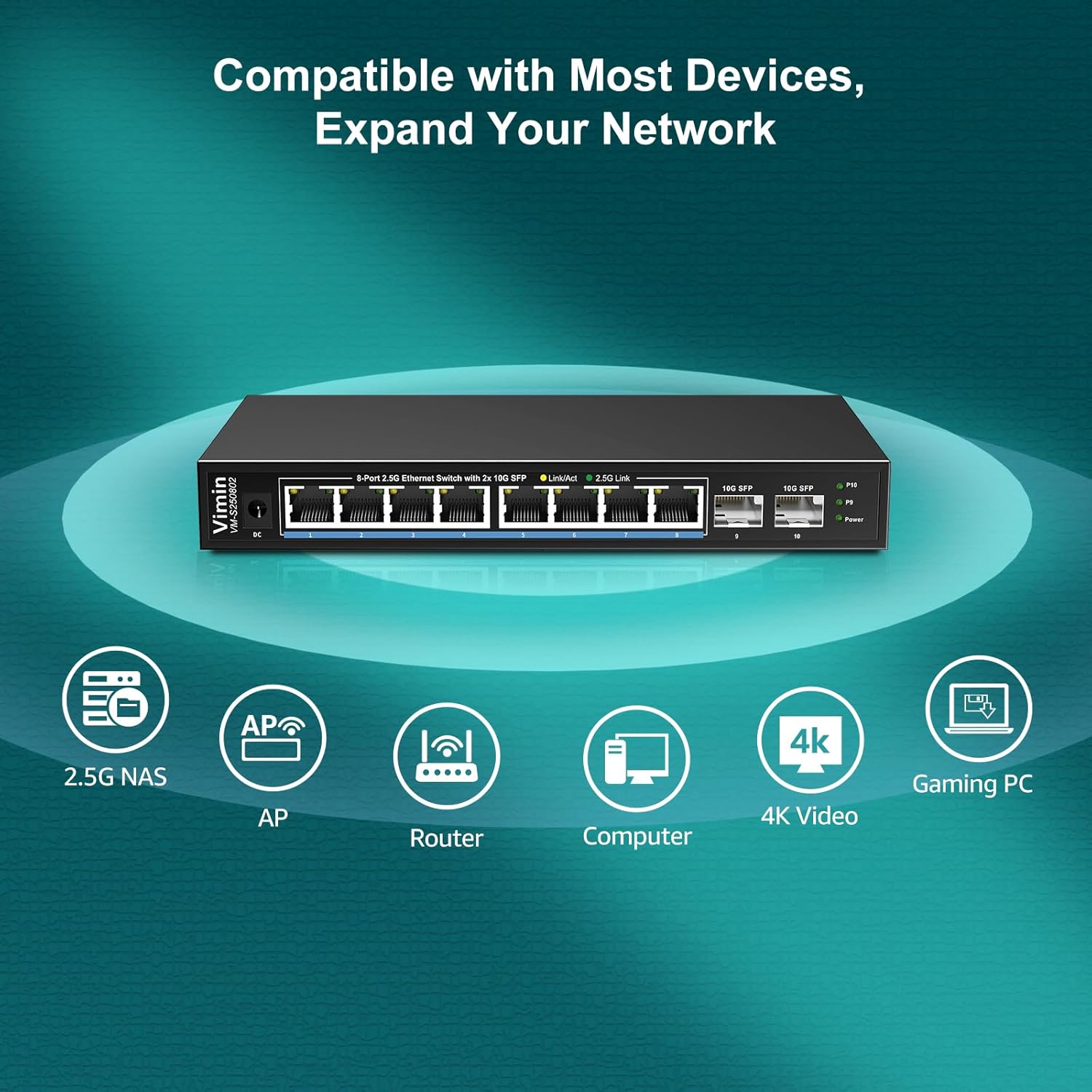 - 🌐2.5G Network Connectivity: The VIMIN 10 ports 2.5g ethernet switch features 8x 2.5Gbps(8*10/100/1000/2500Mbps RJ45 ports) RJ45 ethernet ports and 2x 10Gbps SFP, The 2.5g switch providing high-speed and stable network connections to meet your needs.