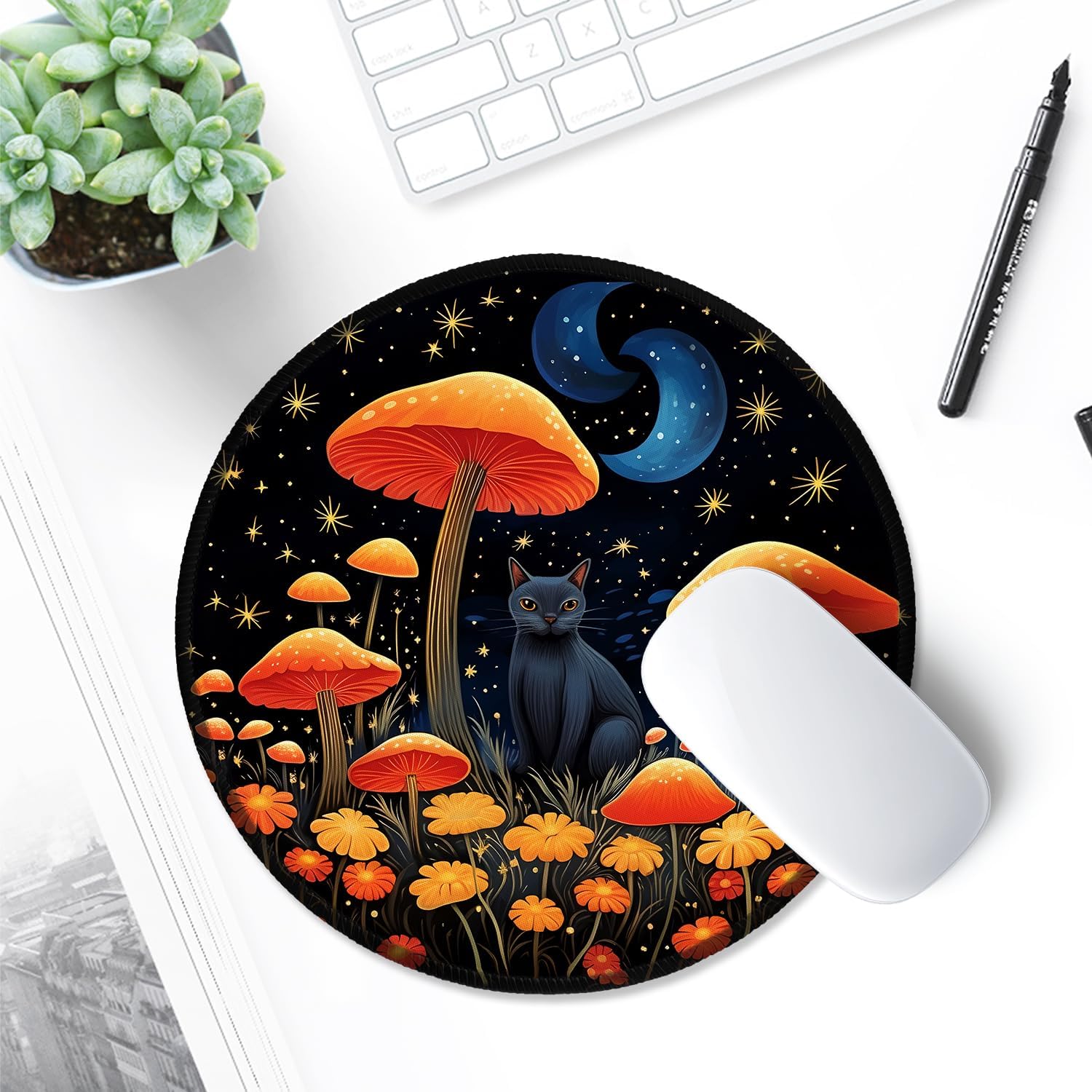 ITNRSIIET Round Mouse Pad with Stitched Edge Premium-Textured Waterproof Non-Slip Rubber Base Desktop Protection Mat Diameter 8.7 inches, Cat and Mushroom