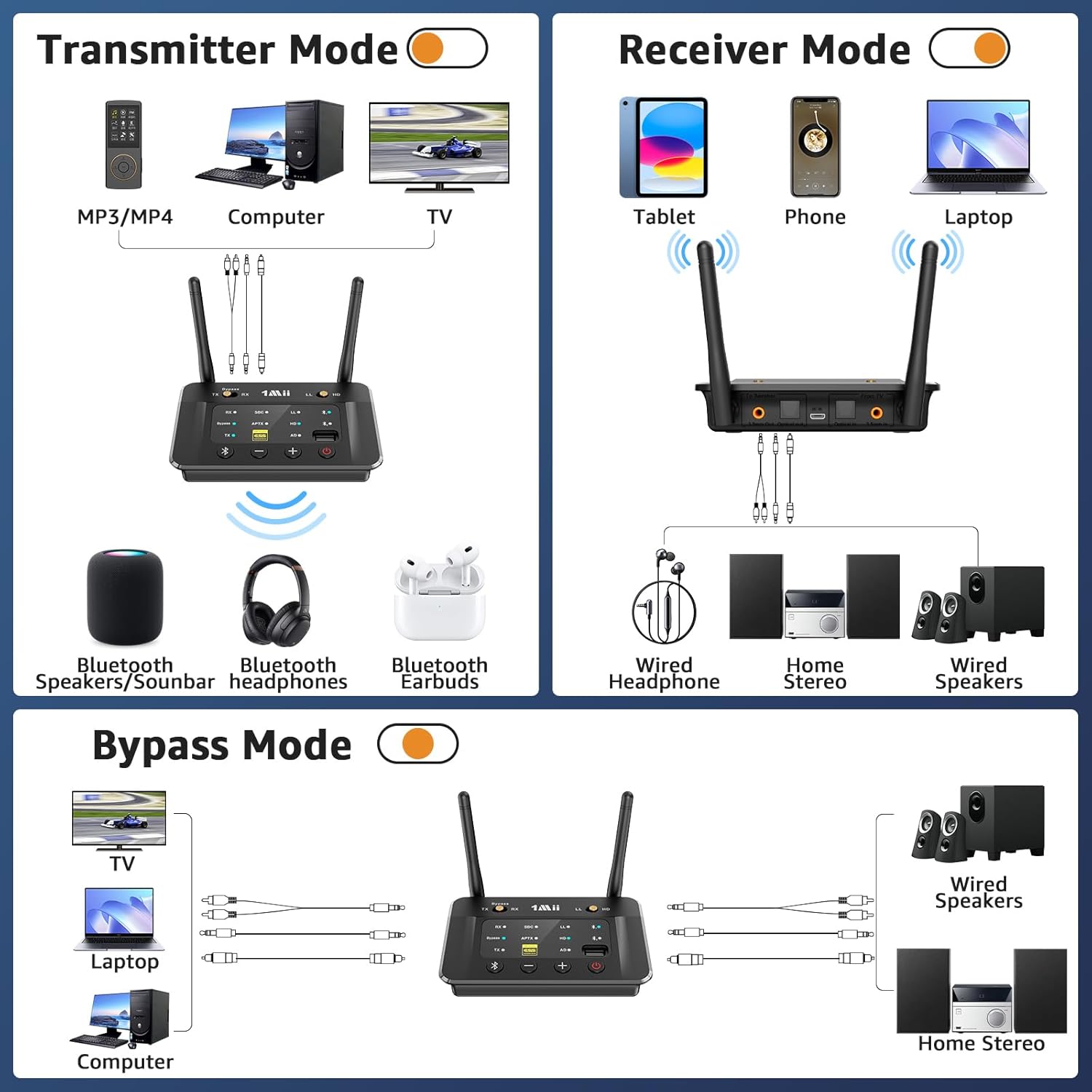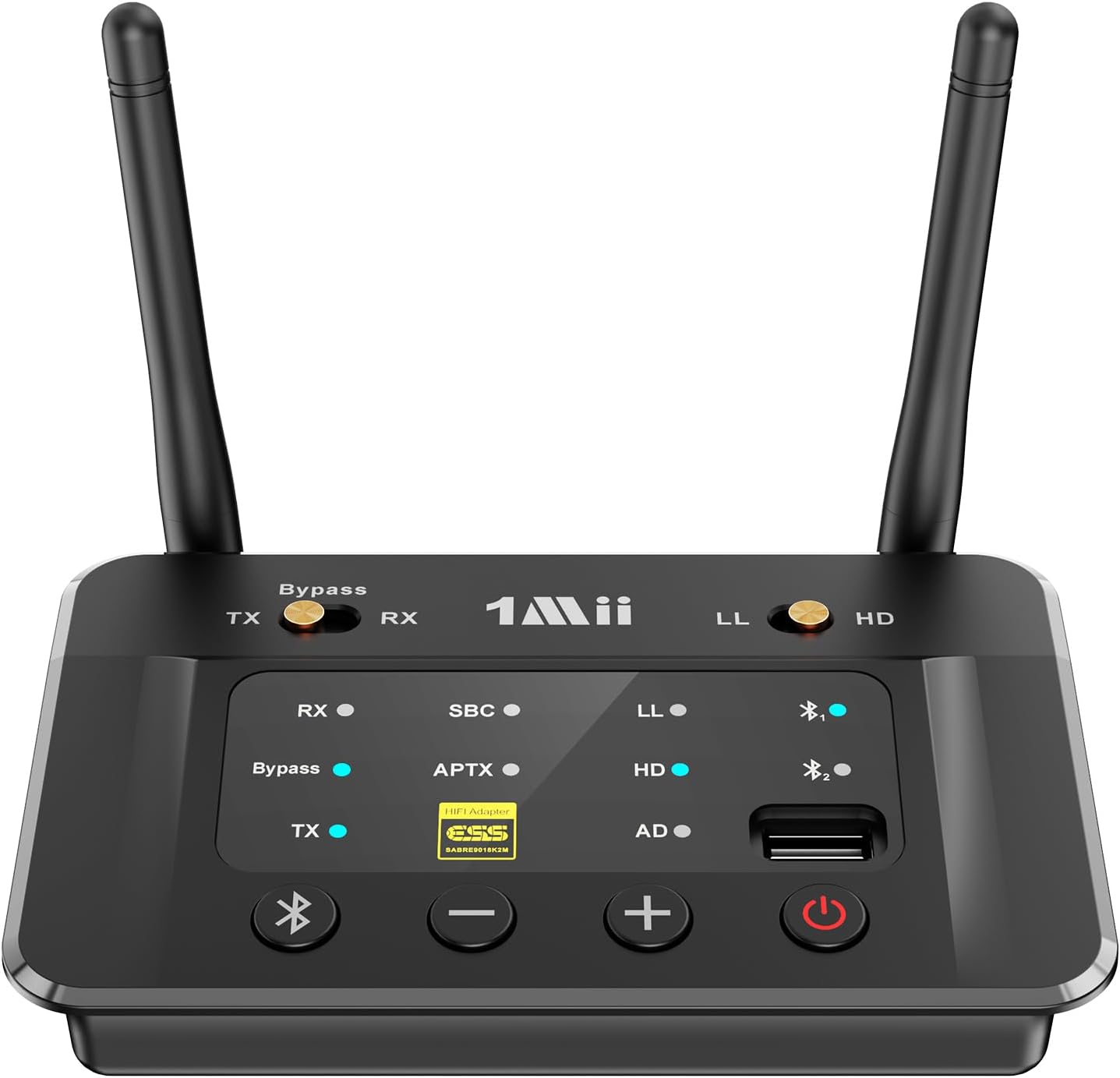 - 【Versatile Transmitter/Receiver】The 1Mii B03S Bluetooth Transmitter/Receiver elevates your audio setup with the latest Bluetooth 5.3 technology. In TX mode, it streams audio from your TV, DVD player, or other devices to Bluetooth headphones or speakers for a wireless experience. In RX mode, it lets you stream music from your phone, tablet, or laptop to your wired stereo system, turning your traditional setup into a modern, Bluetooth-enabled system