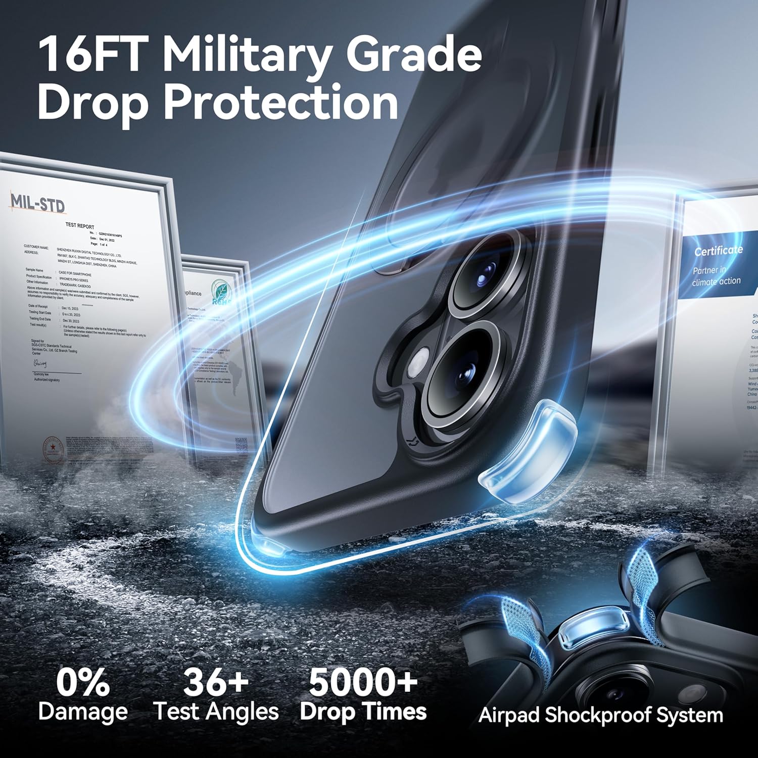 - [16FT Military Grade Protection] Based on 5000+ extreme drop resistance tests, the MagicStand case's durability and sturdiness surpass most ordinary phone cases. It passed the Military Grade test by the (MIL-STD-810H 516.8). The shockproof polycarbonate back and airpad cushioning enhance protection against daily drops and bumps. A 2.5mm raised camera border prevents lens scratches, while a 1.24mm bezel safeguards your screen