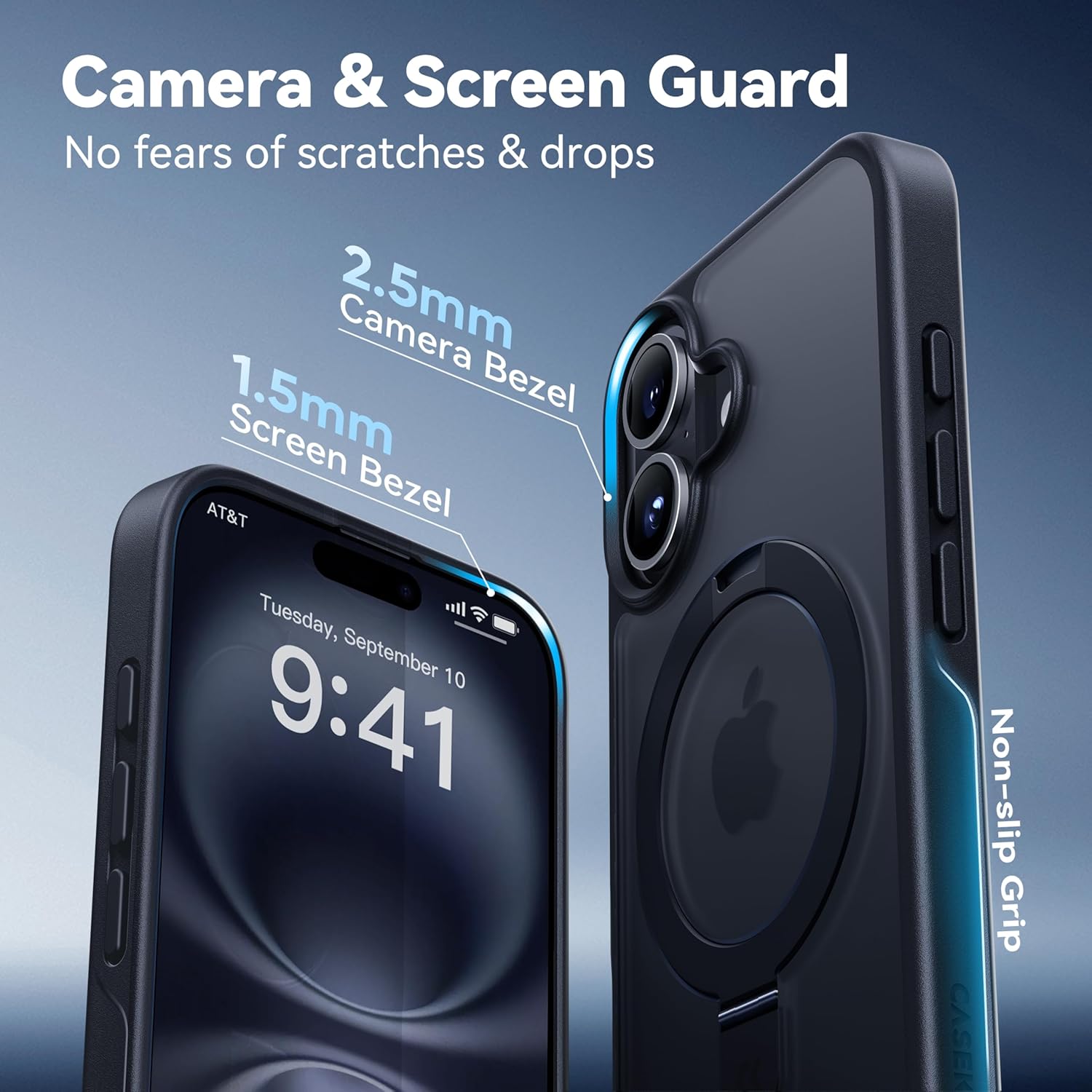 - [16FT Military Grade Protection] Based on 5000+ extreme drop resistance tests, the MagicStand case's durability and sturdiness surpass most ordinary phone cases. It passed the Military Grade test by the (MIL-STD-810H 516.8). The shockproof polycarbonate back and airpad cushioning enhance protection against daily drops and bumps. A 2.5mm raised camera border prevents lens scratches, while a 1.22mm bezel safeguards your screen