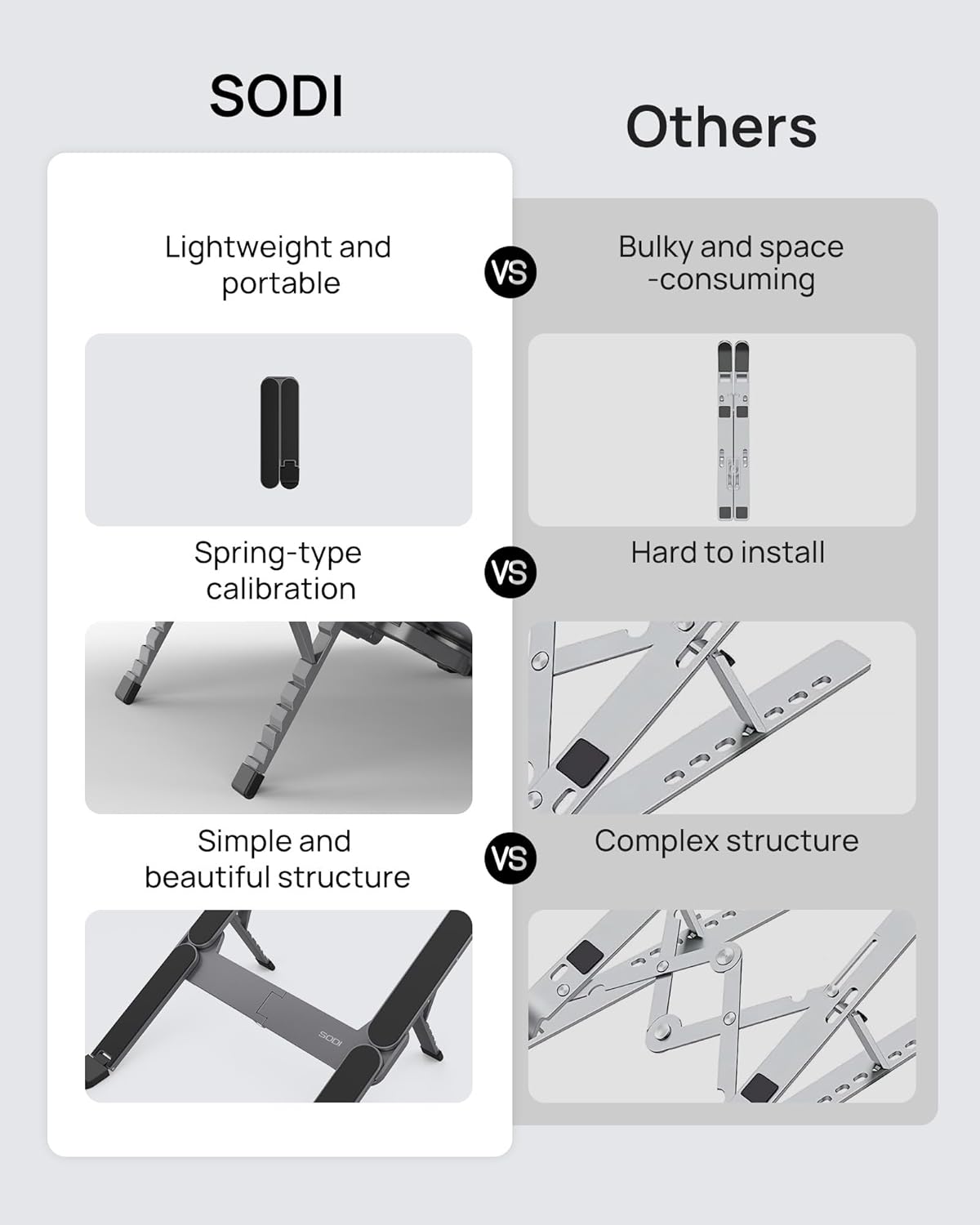- 【Innovative & Ultra Compact】 The SODI Bi-foldable laptop stand weighs only 185g (iPhone 16 Pro weighs 199g) and folds up to 12.7*4.4*2cm, making it ultra light and easy to carry in your backpack or pocket for effortless mobility. Perfect for business trip, daily travel, library, cafes work, etc.